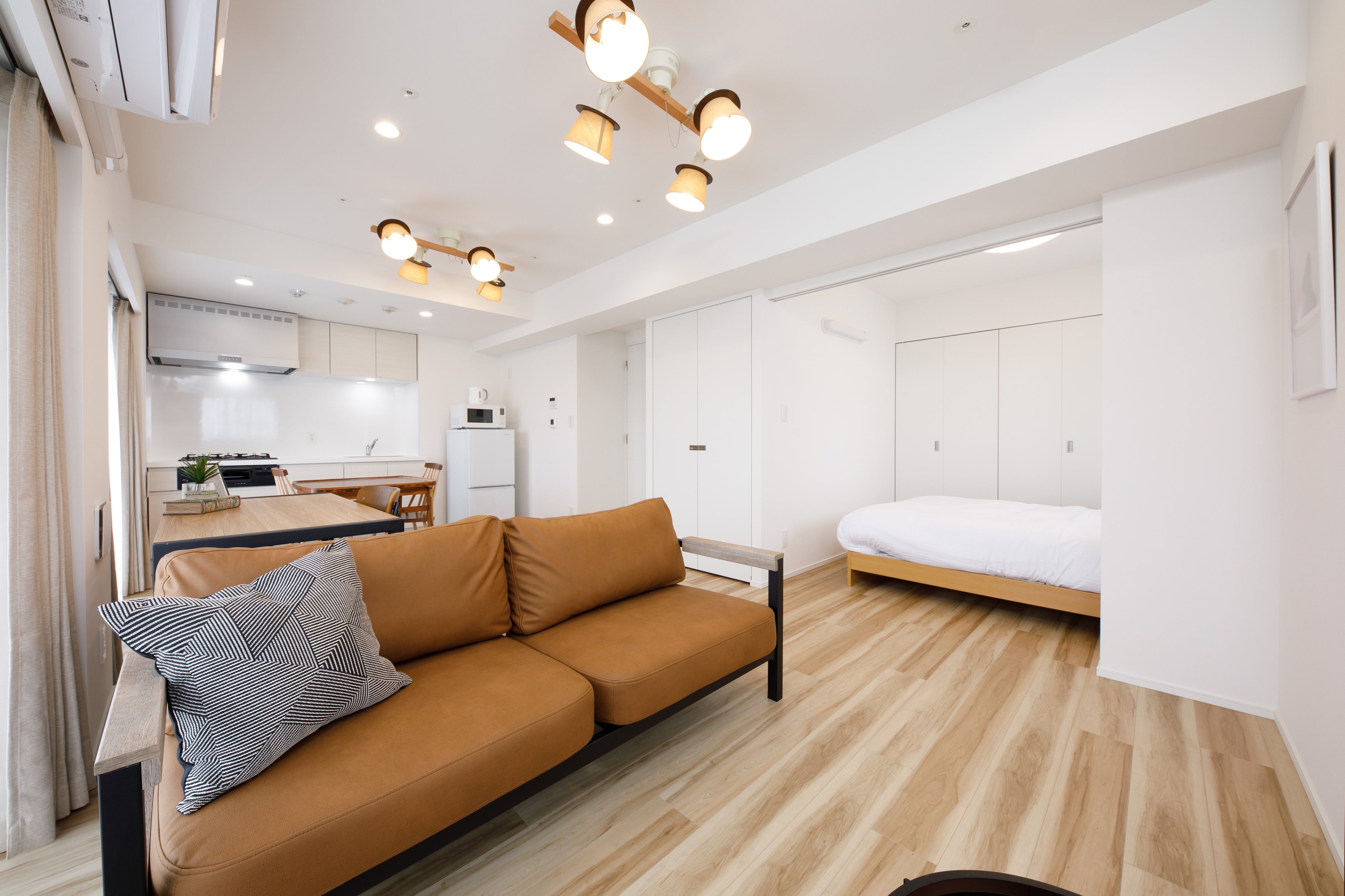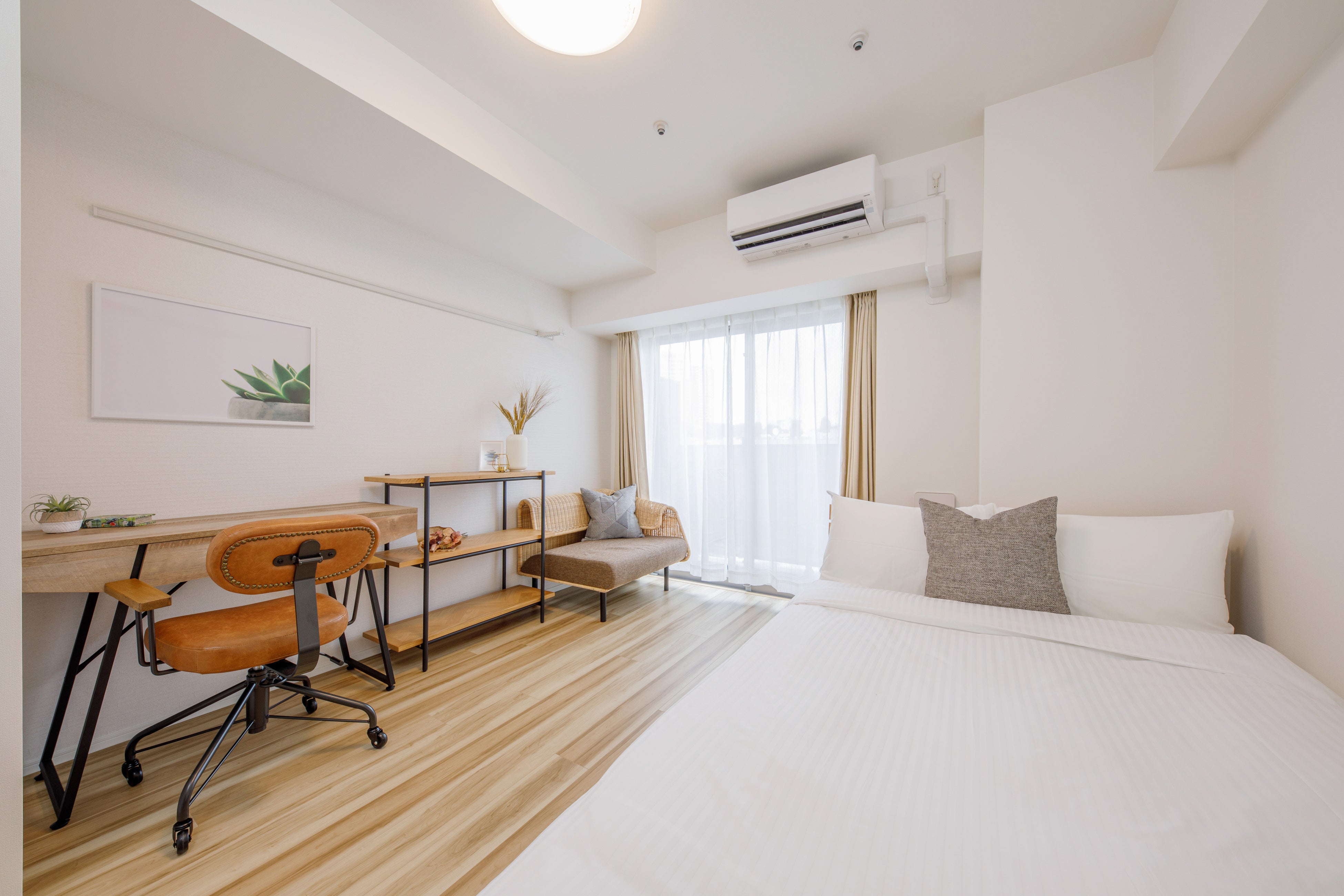 全住戸家具付のHmlet東五反田は、3タイプのデザインをご用意。ウッドモダンのお部屋に温もりを感じるナチュラルカラーの家具を配置したレギュラールーム。在宅勤務をサポートするデスクやチェアを備え、落ち着いた色味でクールな印象を与えるリモートワークルーム。広々とした空間を活用し、二人掛けのソファとデスクを配置することで、くつろぎと集中を兼ね備えた暮らしを叶える1LDKルーム。ご自身のお好みにあわせてプランを選択いただけます。