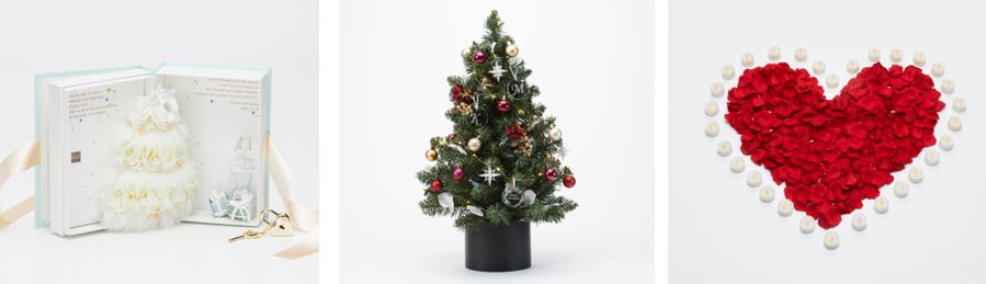 また、同棲しているカップルや遠距離恋愛をしているカップルにオススメの、いつも相手の存在を感じられるクリスマスツリーやたったの10分でサプライズな非日常空間に変わるバラの花びら(造花)約400枚とLEDキャンドルライト30個がセットになったサプライズ演出グッズは、日常を特別なひとときに演出できます。