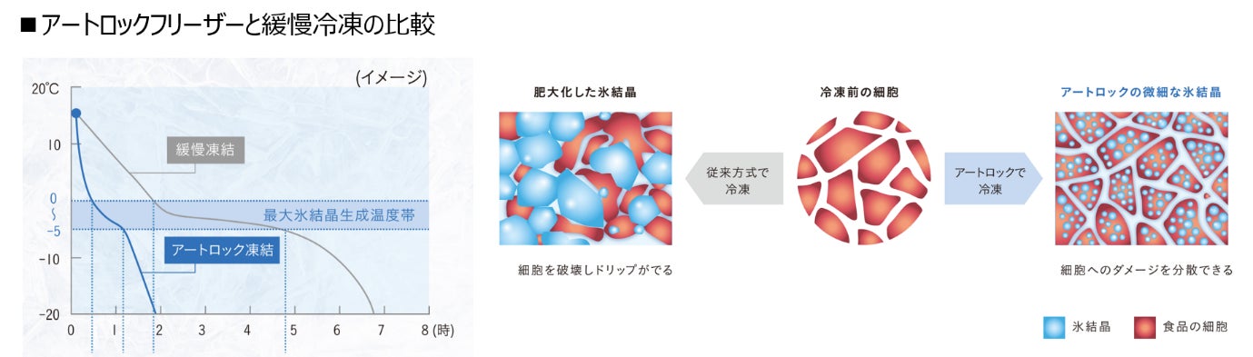 急速冷凍に凍結媒体ごとの特殊な技術を踏襲することで、さらに高品質な冷凍を実現する技術です。一般的な冷凍の場合、細胞内の水分が氷に変わる温度帯(氷結晶生成温度帯:0℃~-5℃)の通過時に、 氷結晶が大きく歪になることで細胞が損傷。一方急速冷凍は、急速かつ均一に冷却することで氷結晶が小さく生成され、細胞の損傷を極少化でき、うまみ成分の流出を防ぎます。さらに特殊冷凍では、冷風の湿度や冷風の当て方などの特殊技術が加わり、形状維持や調理済みのあたたかい食品の急速冷凍を実現。これまで困難とされていた食材の急速冷凍を可能にするとともに、従来を上回る高品質な冷凍食材を生み出します。