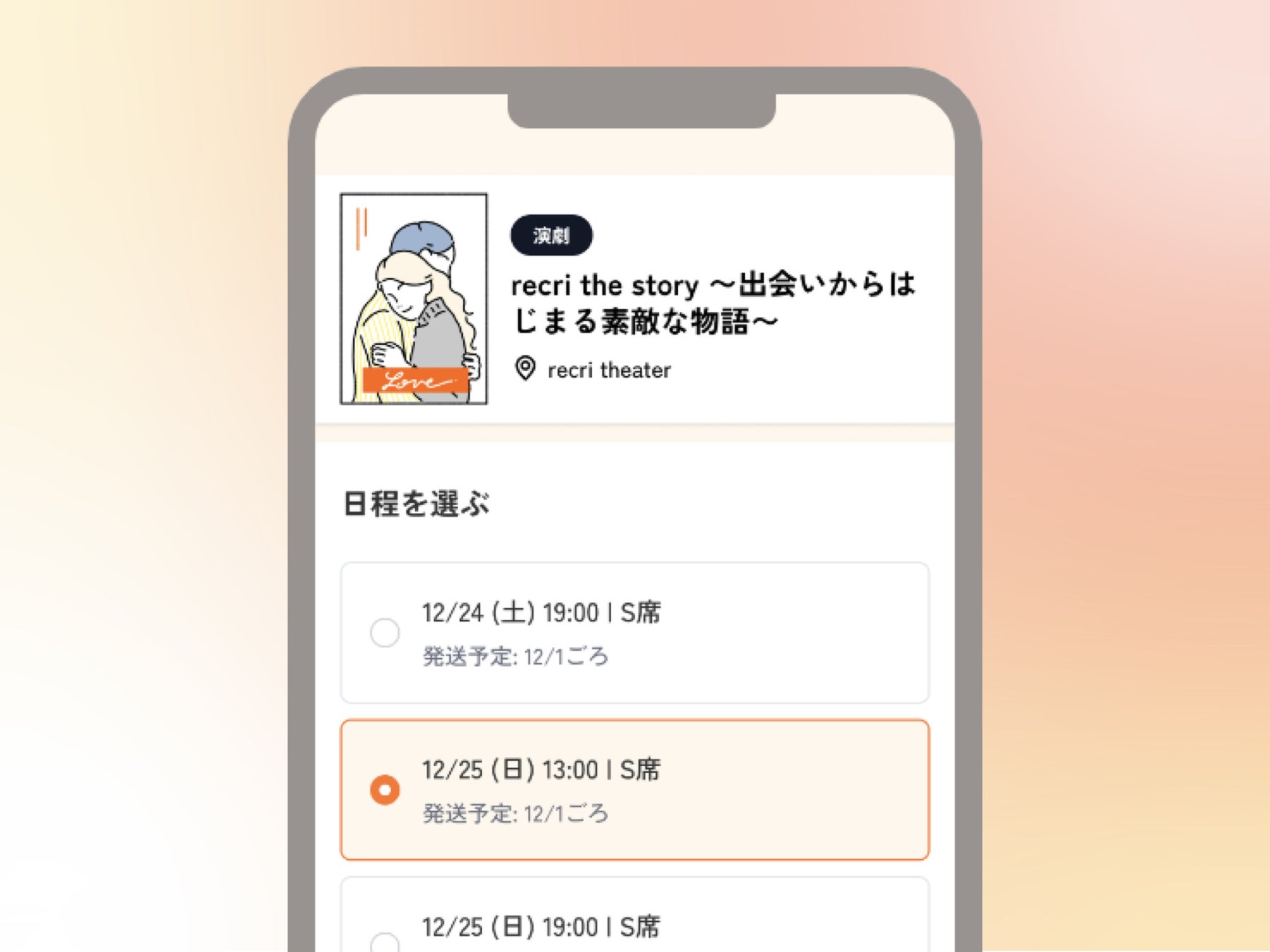 「チケットのサブスクrecri」は、厳選されたおすすめ作品の中から、毎月舞台を観られるチケットのサブスクサービスです。演劇、ミュージカル、歌舞伎、コンサートなど、recriが提案する作品の中から好きなものを選ぶと、チケットが自宅に届きます。自分では選ばない作品を観てみたい方や、あたらしい趣味をつくりたい方にご利用いただいています。月に一度の自分へのご褒美や、ご家族やご友人へのプレゼントにも最適です。必見の名作から話題の最新作まで、作品との心がうごく出会いを、お届けいたします。