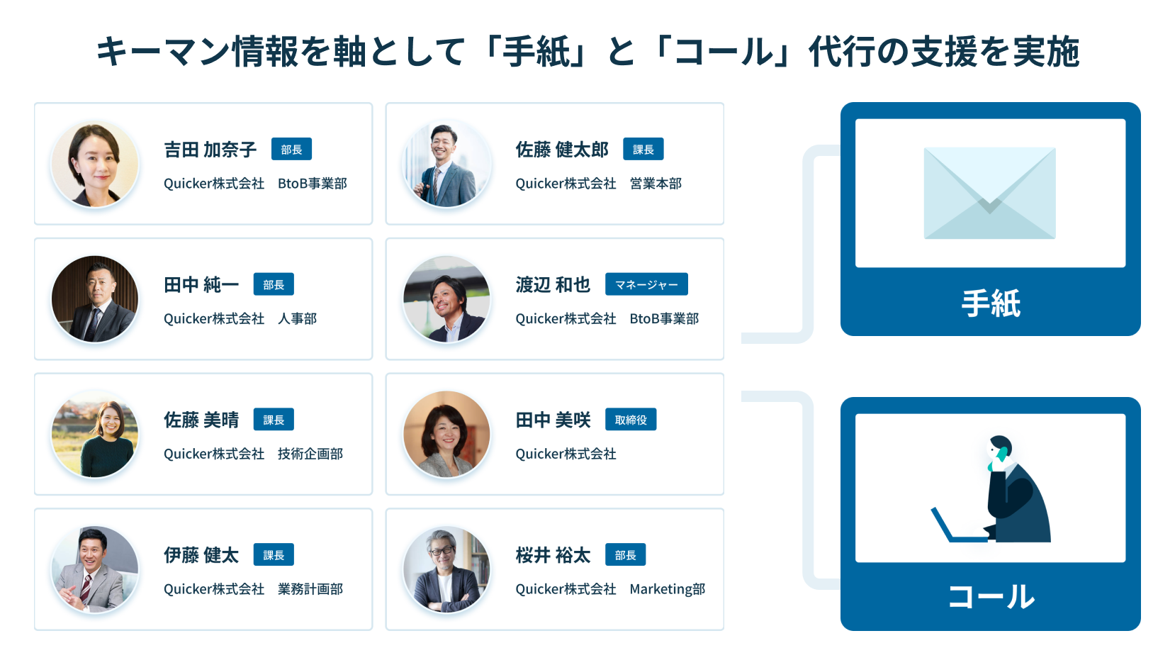 そこで我々は、独自で、頻度高く&人力で正確に取得した「キーマン情報」を軸とした上で、エンタープライズ開拓に必須である「手紙」と「コール」の支援も併せて提供することで、売上創出に貢献いたします。