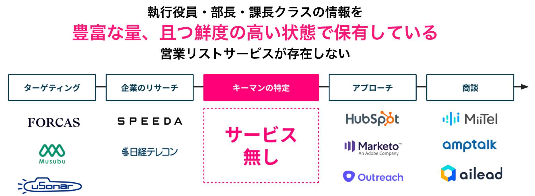 本来、アウトバウンドでのアプローチのあるべき姿は「最小限の工数で最大限の情報を情報を必要としている人物(キーマン)に届ける」ことであると理解しており、その為には「企業単位」では無く「人物情報を軸とした人物単位でのアプローチ」が必須であると考えております。しかし、その人物単位での情報を豊富な量且つ、鮮度の高い状態で提供できているサービスが国内には存在しておりません。