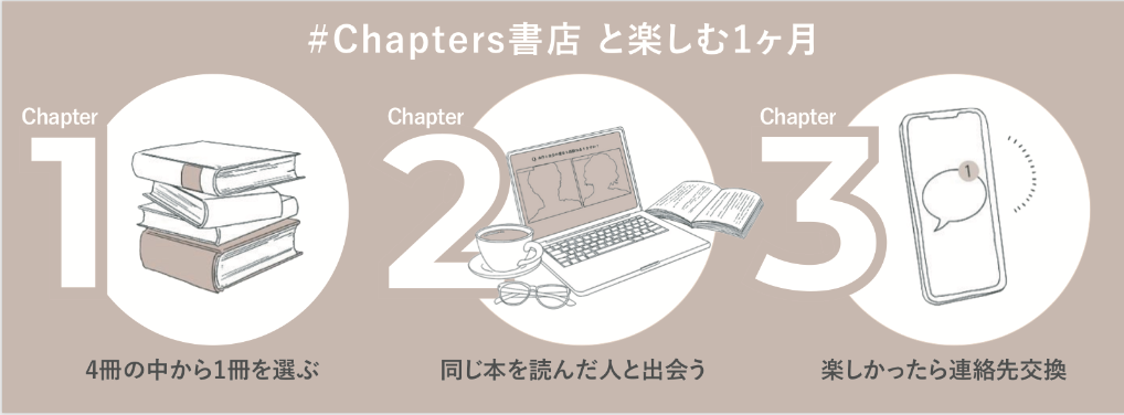 チャプターズは、本棚で手と手が重なるような出会いを叶える月額サブスクリプションのサービスです。オンライン書店にマッチングサービスの機能が付随しており、毎月現役の書店員・出版社が厳選して選んだ本を直感で選択し読むだけで、同じ季節に同じ本を読んだ日本全国のまだ見ぬ誰かとオンラインのビデオチャットで出会える機会が毎週訪れます。