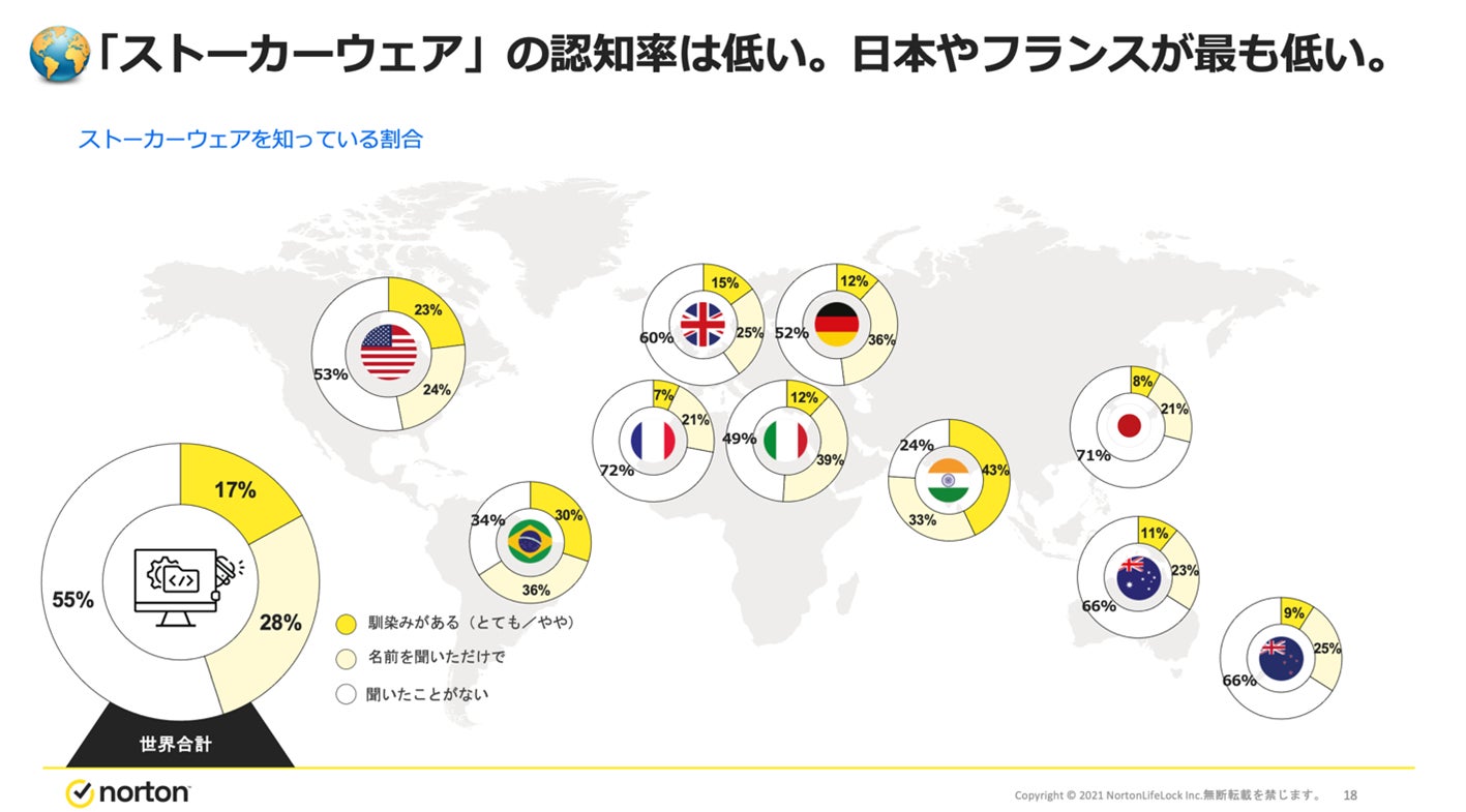 セキュリティブランド「ノートン」は、コロナ禍にグローバルで「ストーカーウェア/ストーカー行為に利用可能なアプリ」 がインストールされていることが確認されたAndroidスマホが増えていることを受け、日本を含む10か国*1 、1万人以上の消費者を対象に「パソコン・スマホを通した監視・ネットストーキング」に関する意識調査*1を実施し、その結果を発表しました。本リリースには、ノートンで検知しているストカーウェアの利用実態に関するデータも含んでいます。本稿において、「ネットストーキング」とは「インターネットやデバイスを悪用し、特定の人物の行動を同意なしに監視すること」を指します。