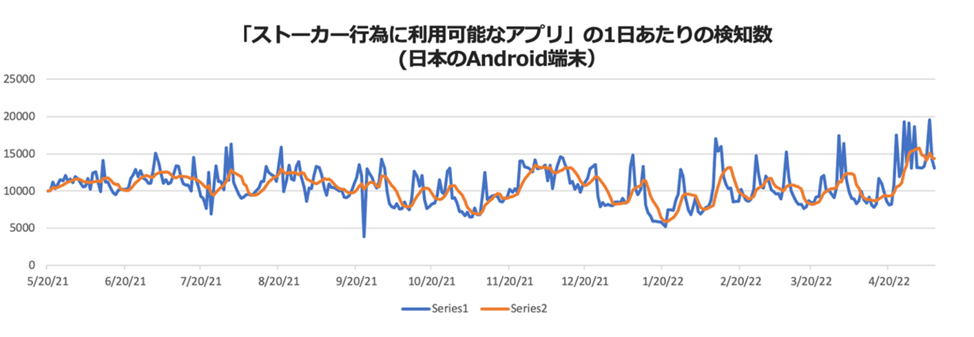 日本においては、1年間(2021/5/19~2022/4/20)に10万台以上のAndroidスマホに「ストーカー行為に利用可能なアプリ」がインストールされていることを検知しています。次のようなアプリはストーカー行為に悪用される可能性があります。