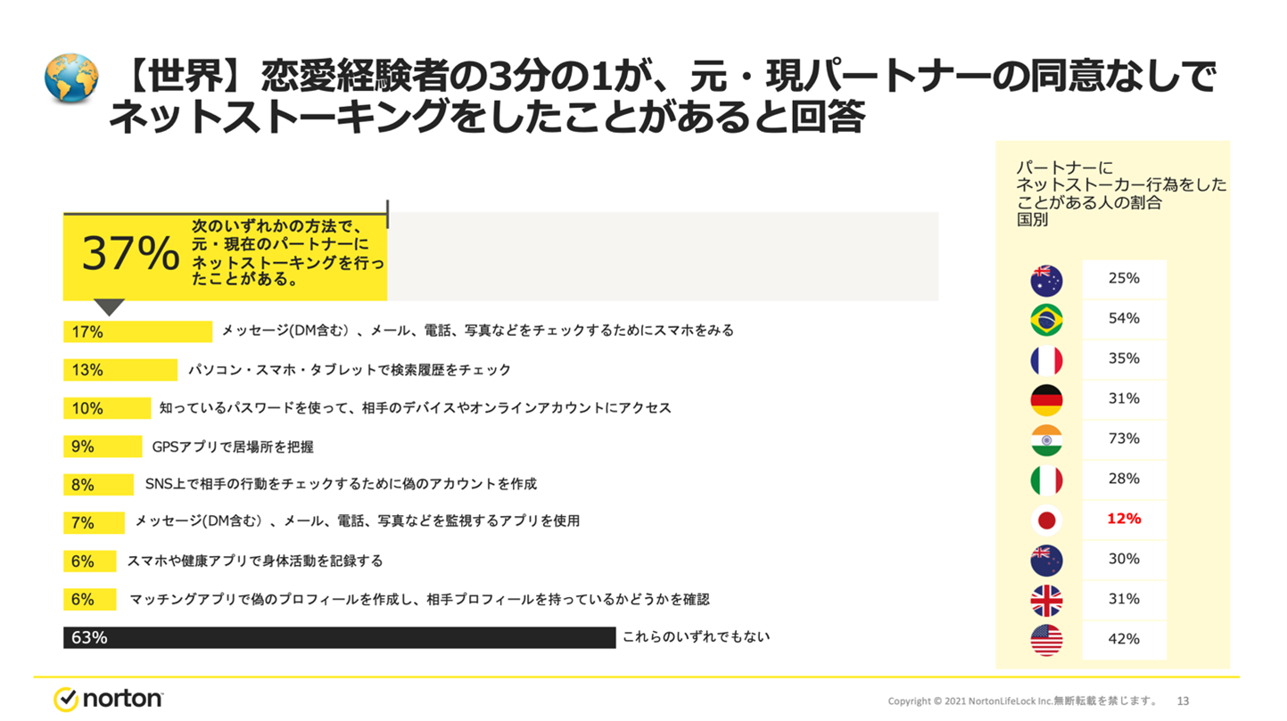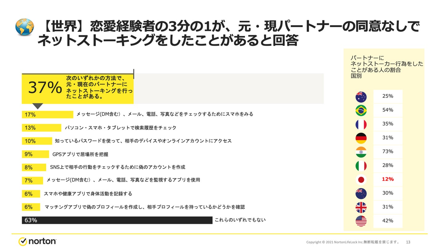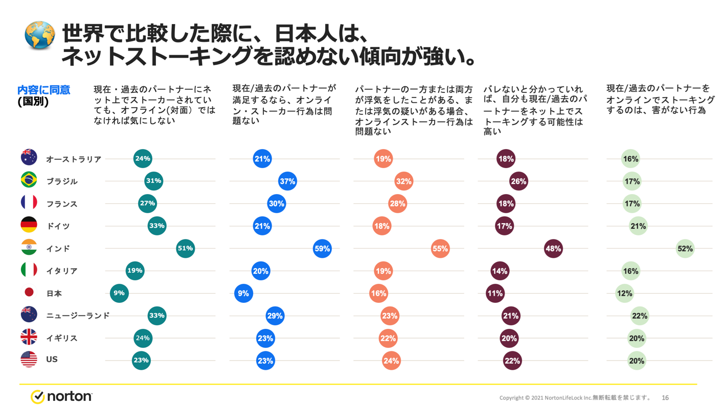 また「元・現パートナーが満足するなら、ネットストーキング行為は問題ない」に対して賛同したのは9%、「バレないと分かっていれば、自分も元・現パートナーをネット上でストーキングする可能性は高い」に賛同したのは11%という結果となり、これらも10か国の中で最低値を記録しました。