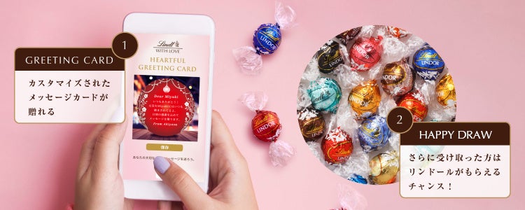 「ハートフル グリーティングカード」は、自身の大切な人に“思いがけない幸せ”をお届けすることができるバレンタイン限定のキャンペーンです。リンツ公式LINE上で、グリーティングカードを送る相手についてのいくつかの質問に答えると相手にぴったりの種類のリンドールが選ばれ、自分だけのメッセージとともに送ることができます。さらに、メッセージを受け取った相手がリンツ公式LINEと友だちになると、合計30万粒のリンドールが当たる抽選「HAPPY DRAW(ハッピードロー)」にご参加いただけます。