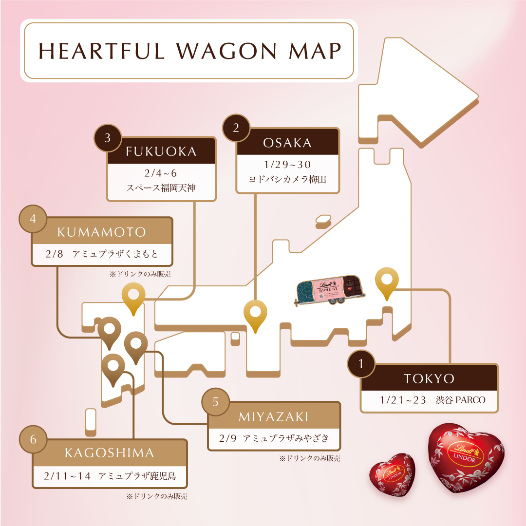 限定ワゴンは、1月21日(金)の東京からスタートしたのち、2月14日(月)のバレンタインデーまで、大阪、福岡、熊本、宮崎、鹿児島を巡り、日本各地で皆様に“思いがけない幸せ”をお届けいたします。ワゴンのラッピングには、見つけることができた方に幸せが訪れることを祈り、赤いリンドールハートのクローバーを一箇所どこかにデザインしております。ワゴンを訪れた際に、大切な人とともに幸運のクローバーを探すワクワクするひとときをお過ごしください。