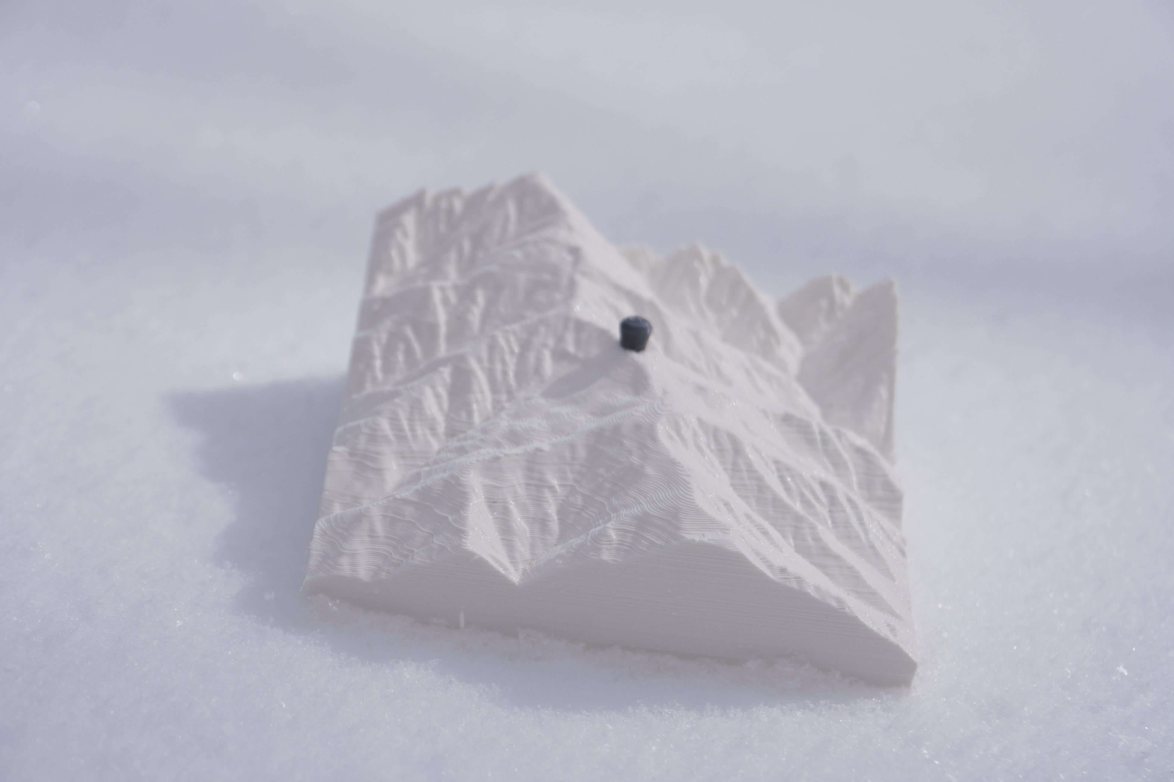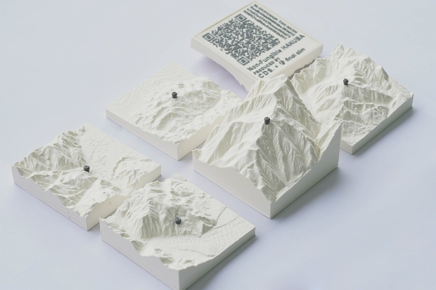 NFT化された各写真情報をもとに生成された3Dマップデータから、3Dプリントオブジェを制作しました。表面は写真撮影された位置情報をもとに影場所を中心とした白馬村の地形を再現し、裏面には投稿画像のNFT情報を刻印。ブロックチェーン上のみならず物理的にも唯一無二な形で残すことに成功しました。