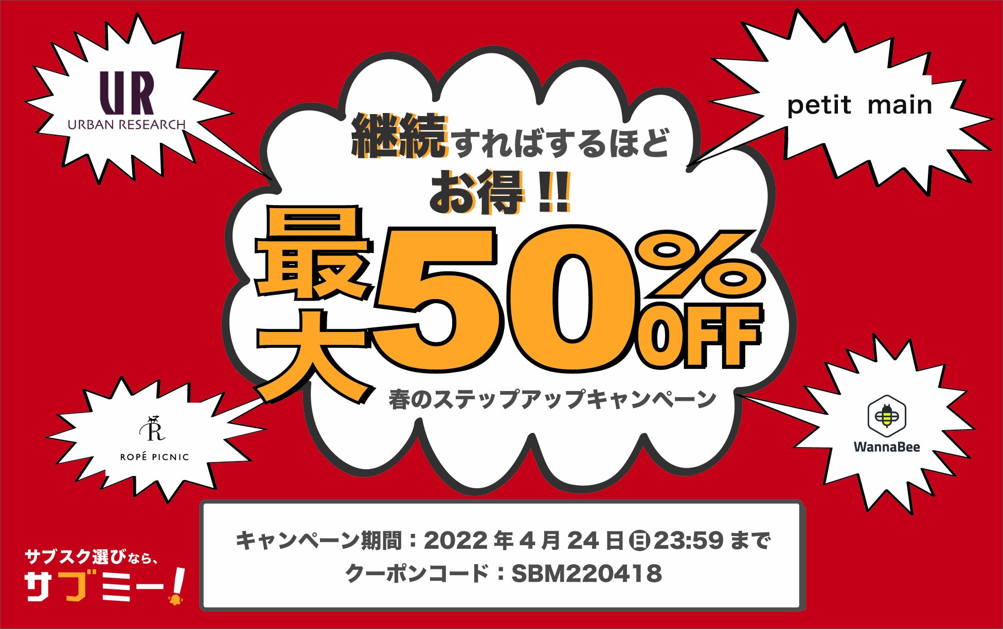 【最大50%OFF!!】日本最大級のサブスクモール・サブミー「春のステップアップキャンペーン」開催中!