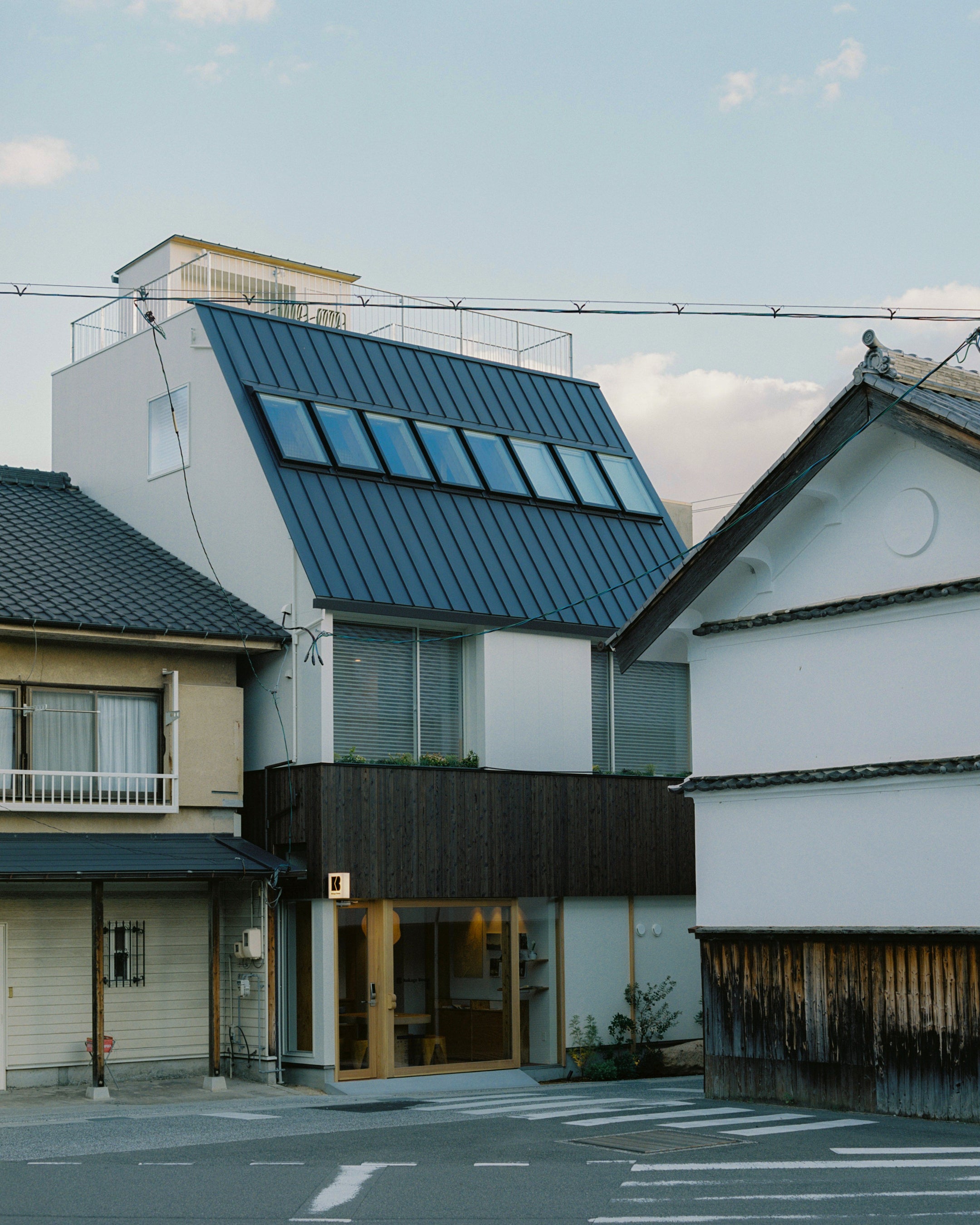 幅約4mの前面道路を挟んだ向かいには、漆喰壁と瓦屋根の蔵を改修したコーヒーロースタリーが佇み、周囲には昭和初期からの木造建築や戦後の旧商店が混在し、島ならではの新旧が入り混じった街並みが広がります。そうした環境に呼応するように、街並みに溶け込むスリムな建築を計画しました。