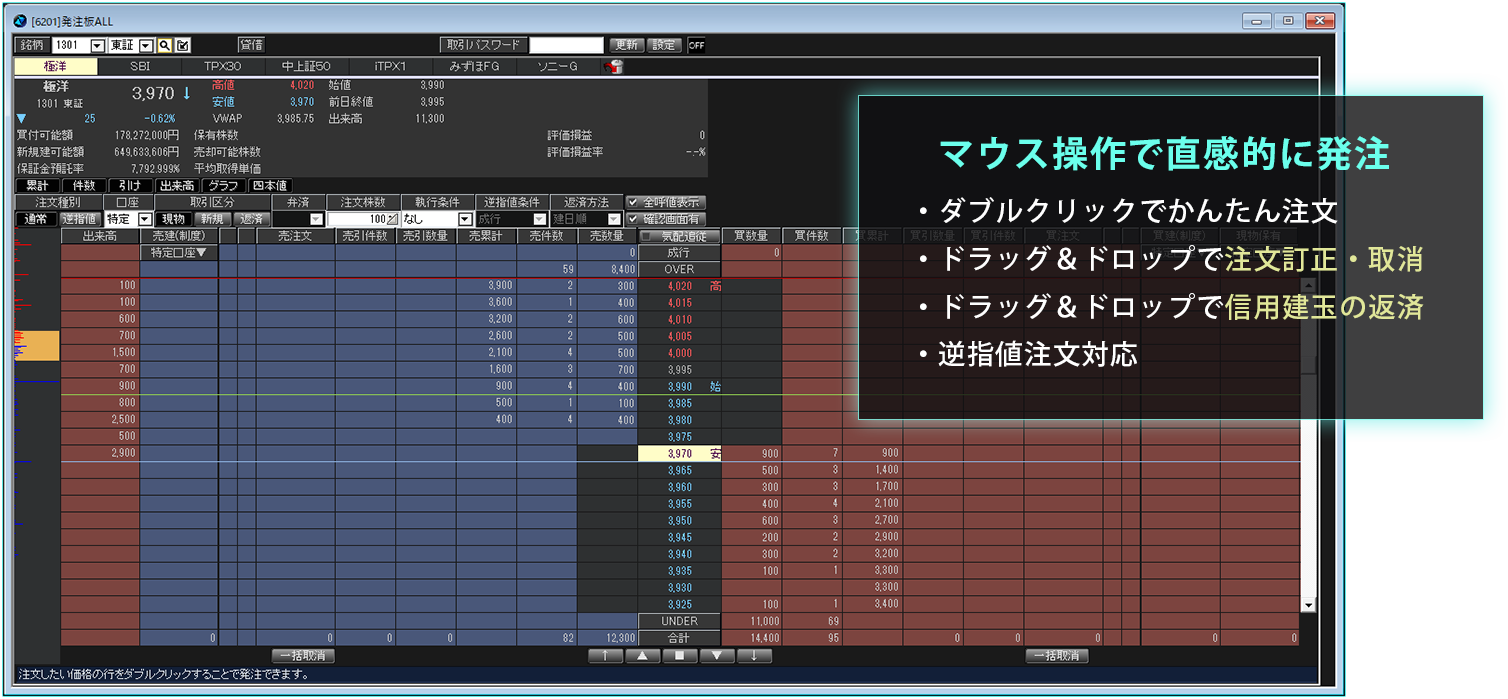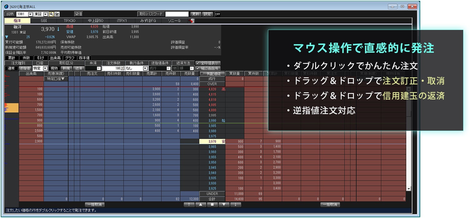 スピーディーな発注が可能な板発注は、上下10本の気配情報と注文データ、保有株/保有建玉状況を板情報内で表示するスタンダードな「発注板」、必要最低限な情報にまとめて表示をコンパクトにした「ミニ板」、「発注板」に東証FlexFullの全気配と、引け条件付き注文情報等を加えた「発注板ALL」の3種類からお好みに合わせてご利用いただけます。