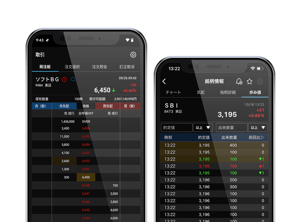 その他、歩み値機能では約定値や出来数量でフィルタをかけられる機能が実装されているほか、お気に入りの表示形式も4本値形式、リスト形式、ヒートマップ形式にスワイプ操作だけで切り替えられるなど、直感的な操作で、様々な機能をご利用いただけます。
