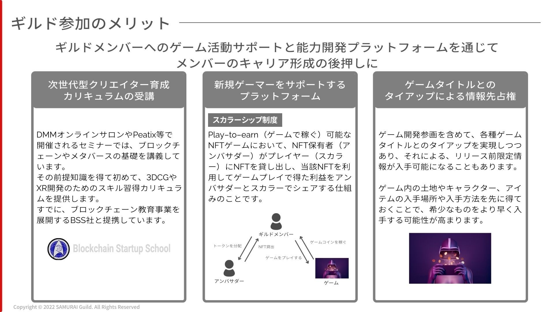 「Samurai Guild Games」(SGG)は、メンバーが“Play to Earn”ゲームへの参入障壁を超えるためのサポートを行い、多くのプレイヤーを創出するとともに、能力開発プラットフォームを運用し、メンバーのキャリア形成もサポートします。