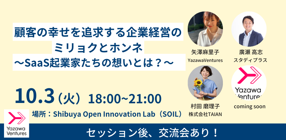 渋谷にて交流会付き『顧客の幸せを追求する企業経営のミリョクとホンネ 〜SaaS起業家たちの想いとは?〜』を10/3に開催
