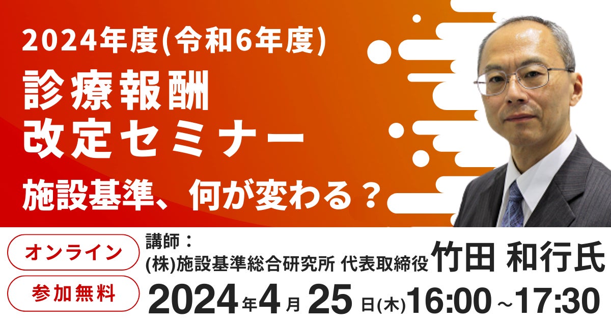 本セミナーでは、『施設基準適時調査マニュアル』でおなじみの竹田 和行氏を講師に迎え、2024年度(令和6年度)の診療報酬改定における施設基準の変更点について解説します。