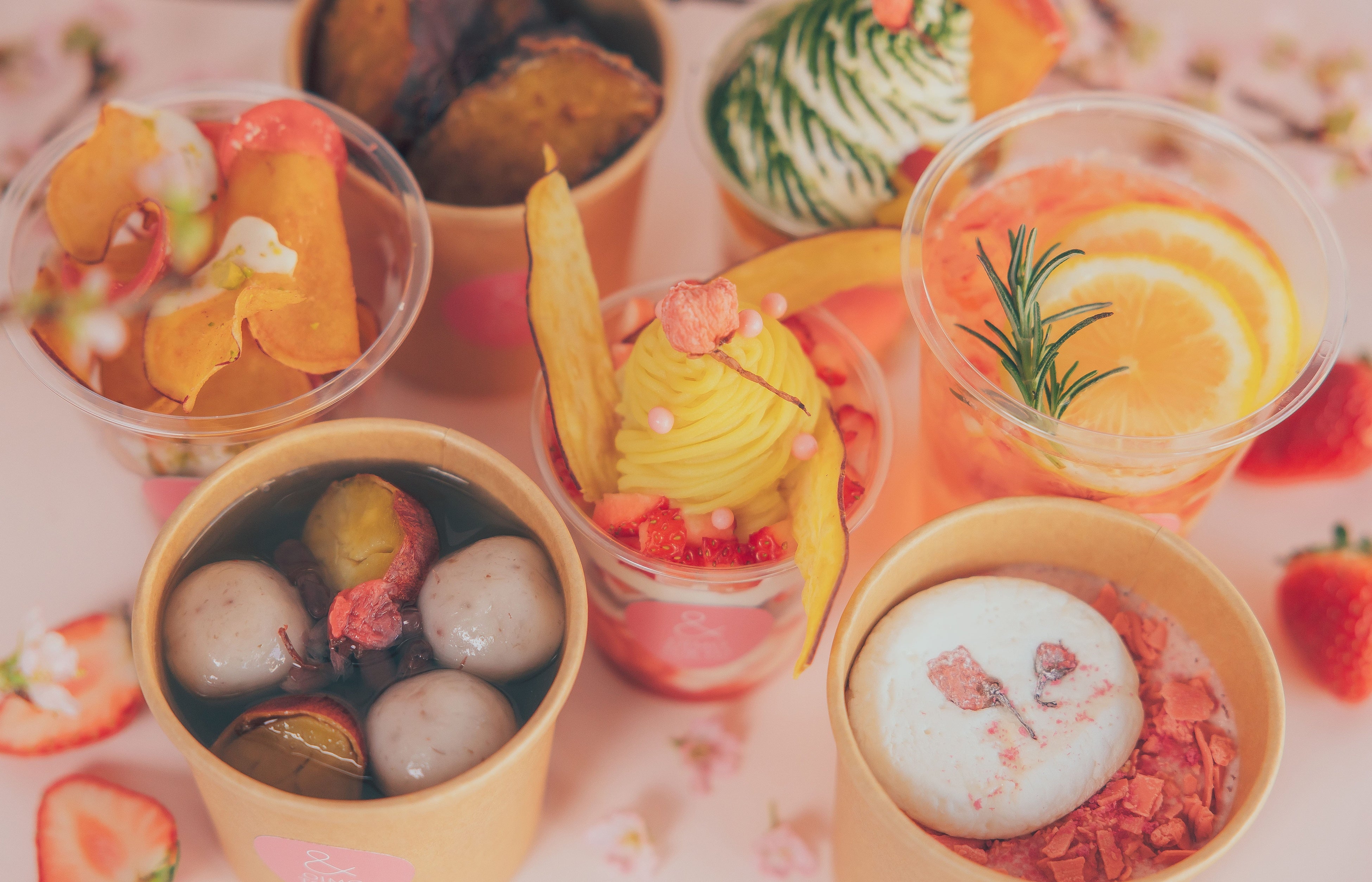 ベースには自家製のヘーゼルナッツのメレンゲ、安納芋のクリーム、苺のピューレを。蜜芋クリームとなめらかな特製ミルクソフトクリームに、アクセントとしてカシスホールや甘露煮を加え、仕上げには春を感じさせる苺や桜のパールを飾り付けました。TVでも多数取り上げられてきた人気メニュー「こぼれ蜜芋モンブランパフェ」を片手に食べ歩きスイーツとしてお花見を楽しんでいただけます。