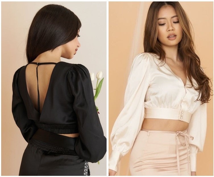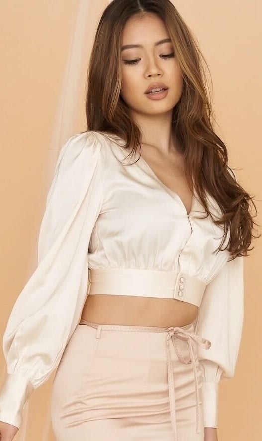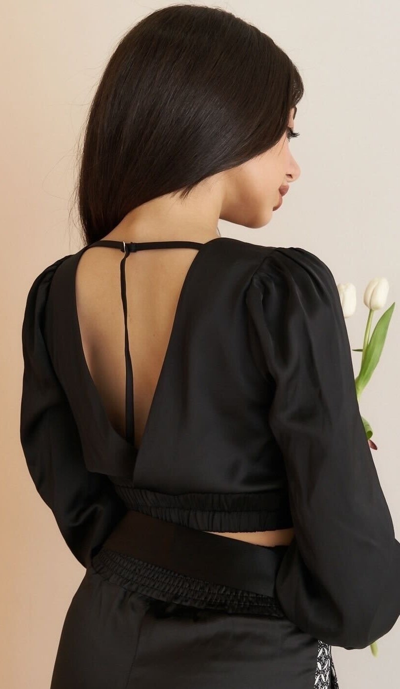 背中部分が開いたデザインと、バルーンシルエットの袖が特徴的なブラウス。袖とボタン部分の麻の葉柄がポイントです。