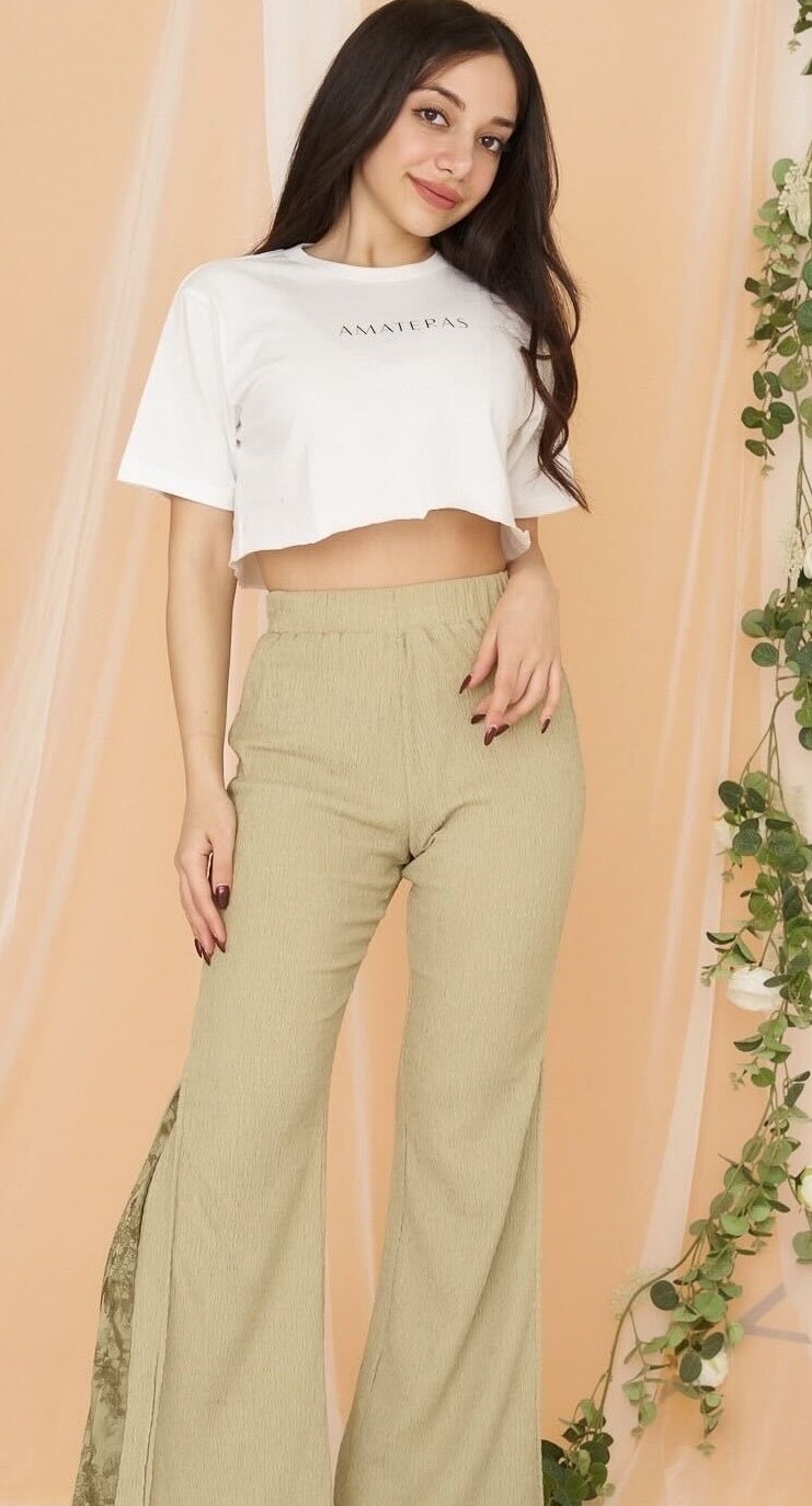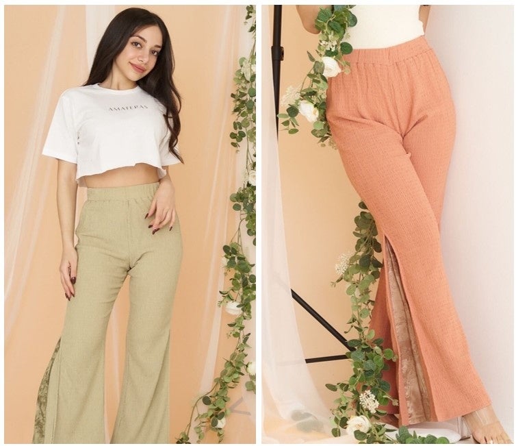 AMATERASの醍醐味でもあるサイドラインパンツがパワーアップして登場。ワイドな裾に加えてハイウエストなデザインのため脚長効果が期待できます。ウエストは伸縮性のあるゴムを使用。共布ベルト付きです。