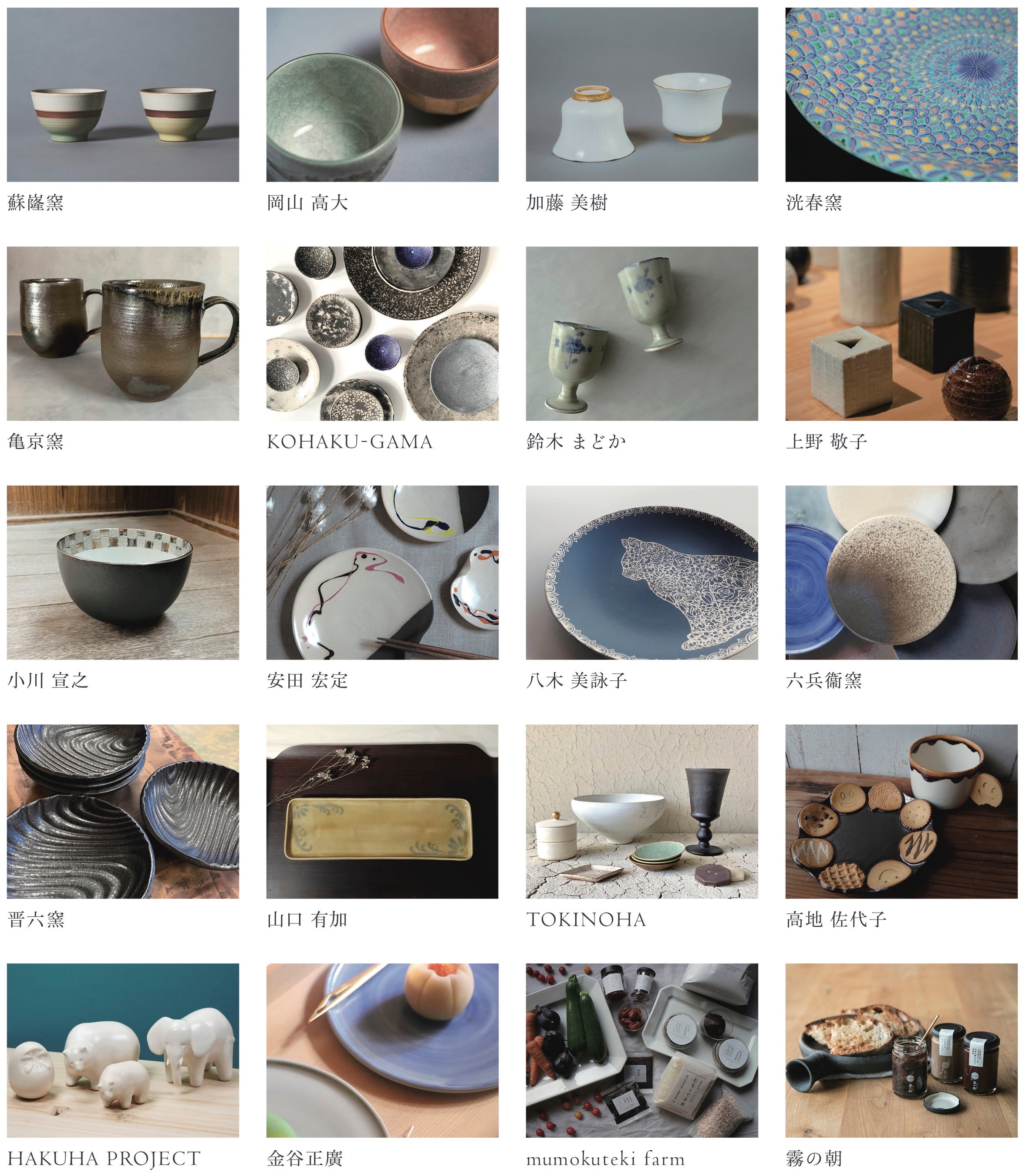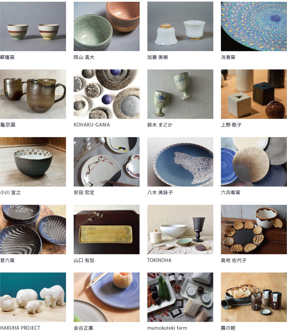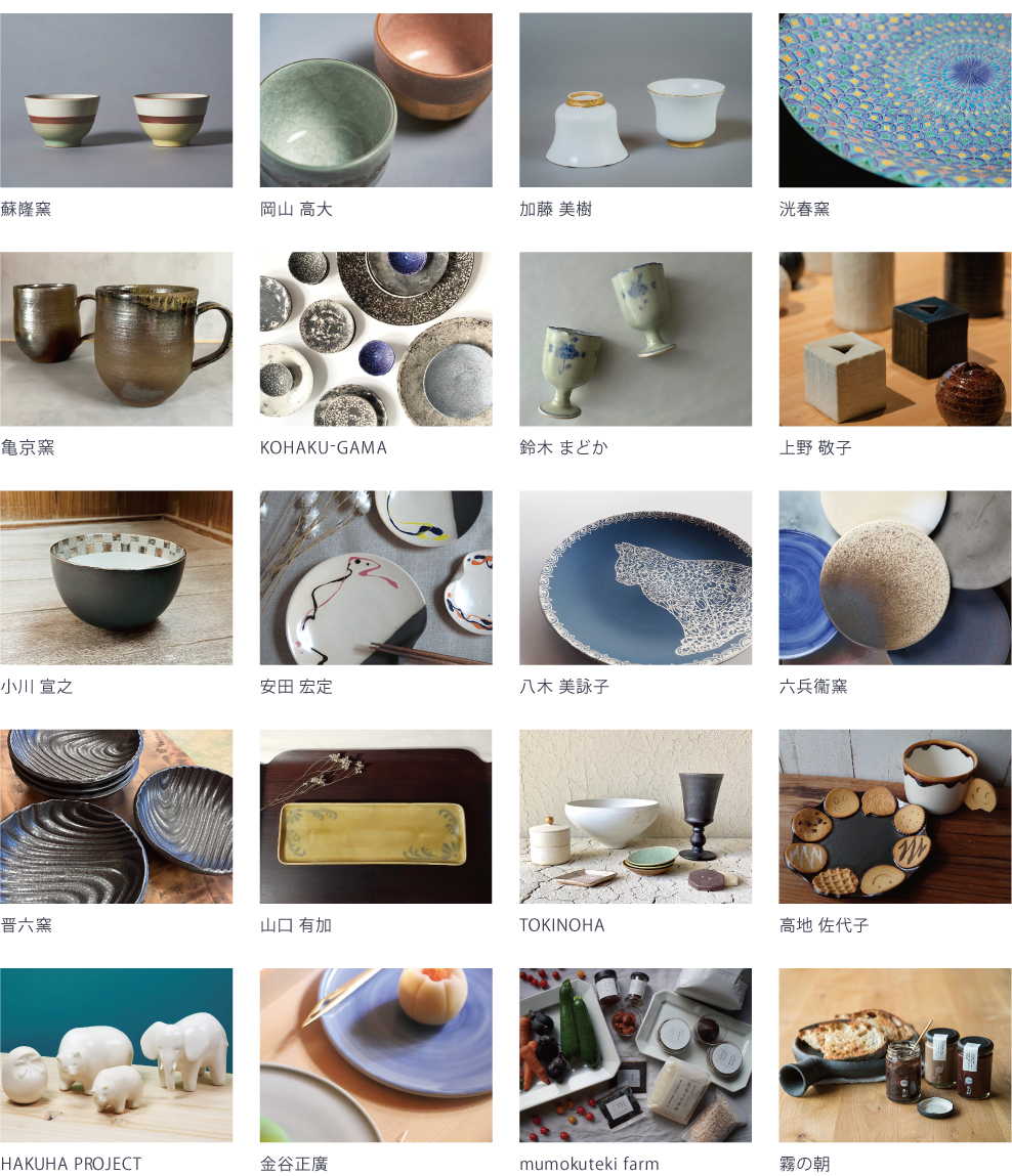 出展者:蘇嶐窯 / 岡山 高大 / 加藤 美樹 / 洸春窯 / 亀京窯 / 鈴木 まどか / 上野 敬子 / 小川 宣之 / 安田 宏定 / 八木 美詠子 / 六兵衞窯 / 晋六窯 / TOKINOHA / 山口 有加 / 高地 佐代子 / KOHAKU-GAMA / HAKUHA PROJECT / 金谷正廣 / mumokuteki farm / 霧の朝
