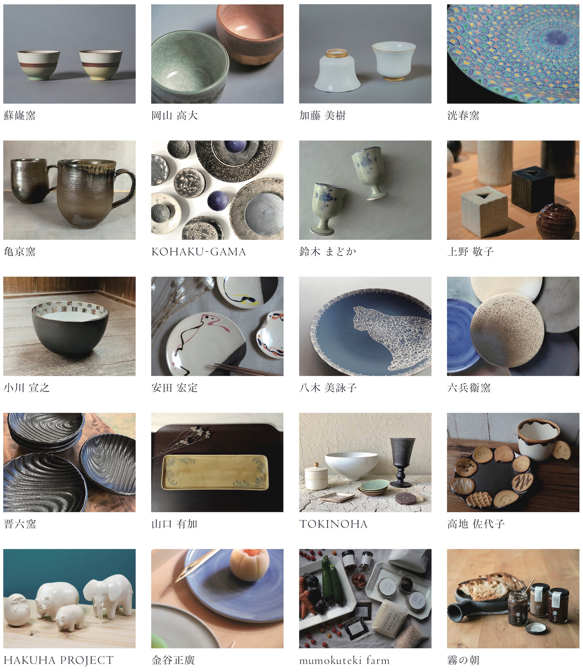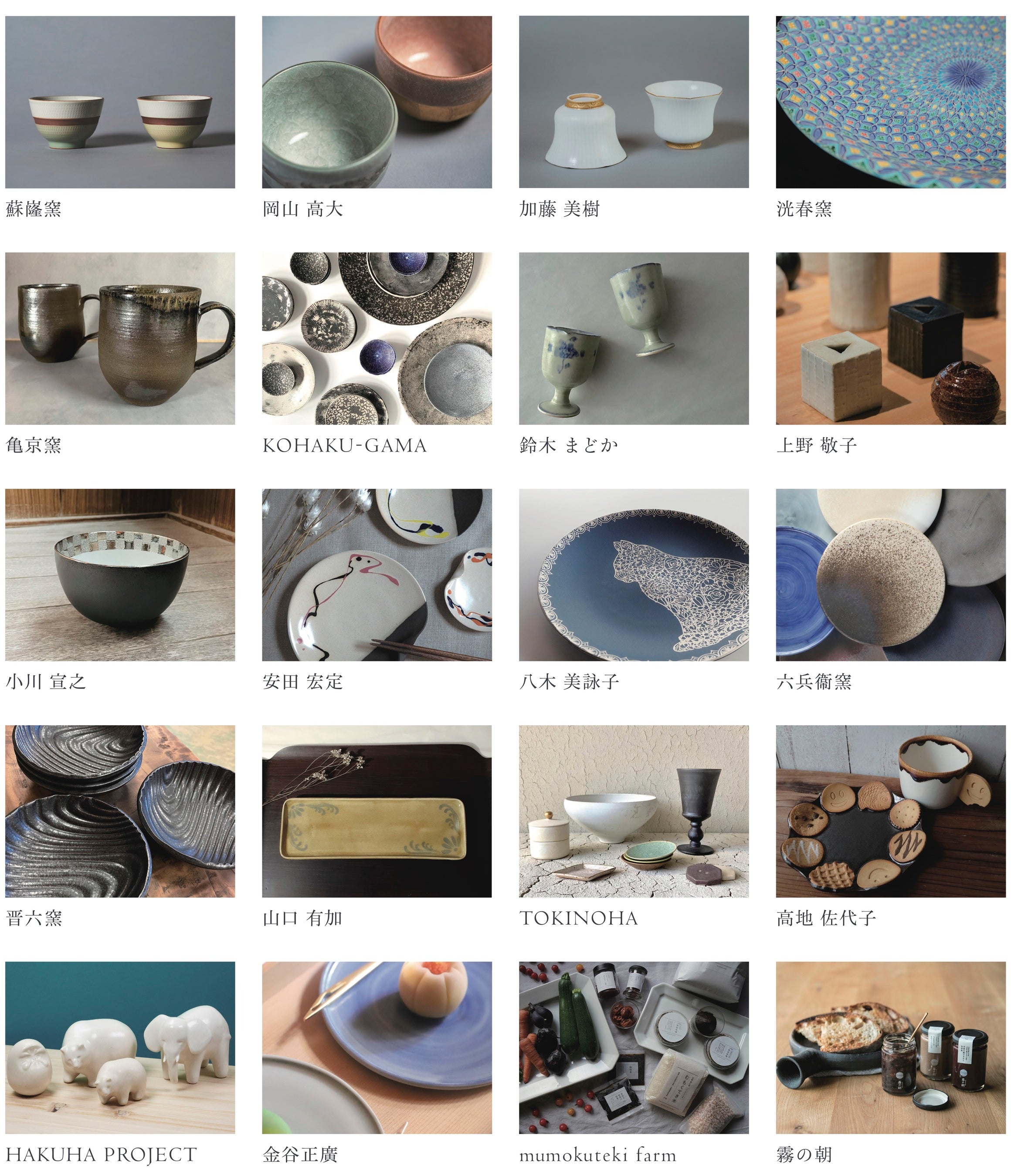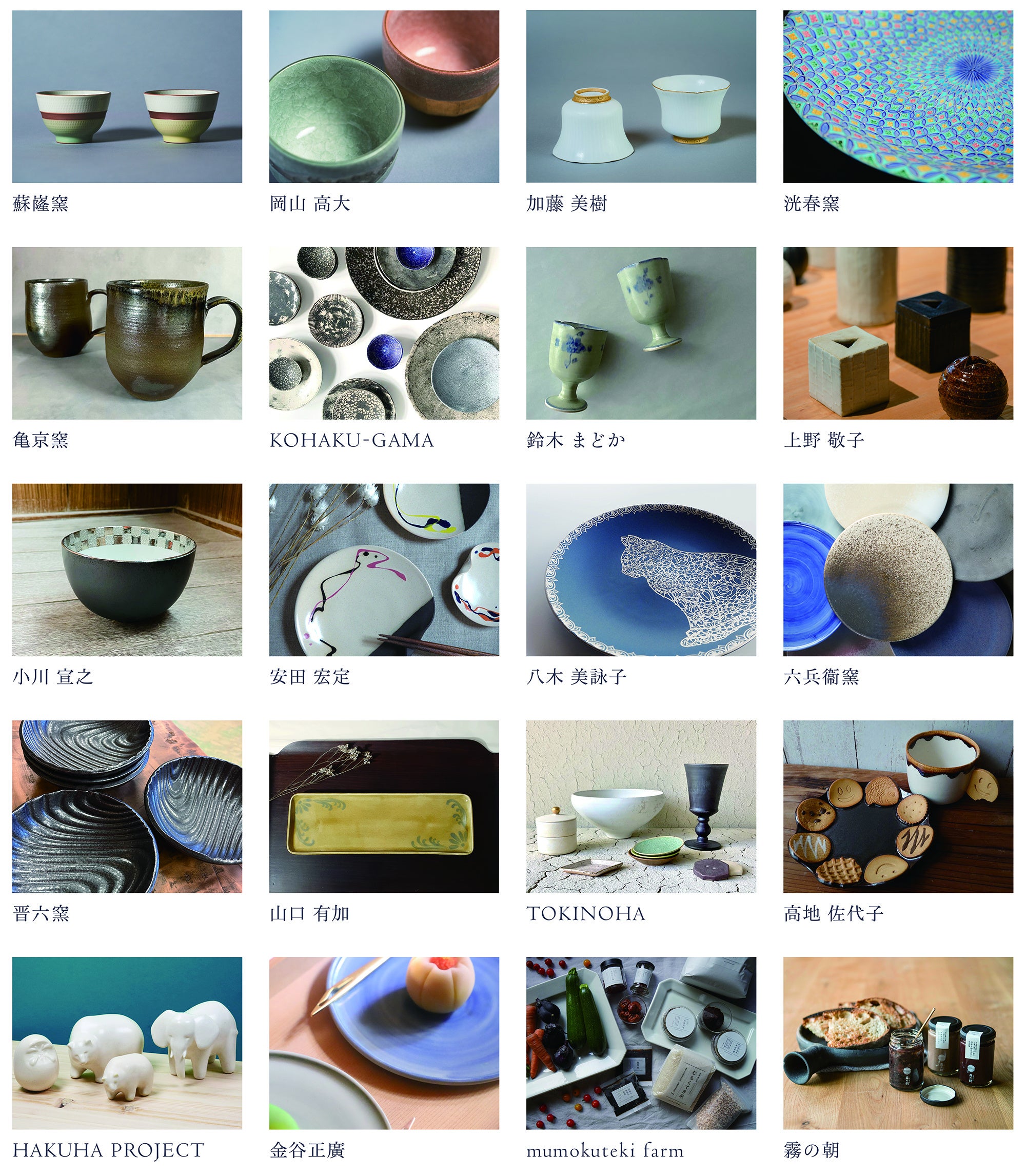 出展者:蘇嶐窯 / 岡山 高大 / 加藤 美樹 / 洸春窯 / 亀京窯 / 鈴木 まどか / 上野 敬子 / 小川 宣之 / 安田 宏定 / 八木 美詠子 / 六兵衞窯 / 晋六窯 / TOKINOHA / 山口 有加 / 高地 佐代子 / KOHAKU-GAMA / HAKUHA PROJECT / 金谷正廣 / mumokuteki farm / 霧の朝