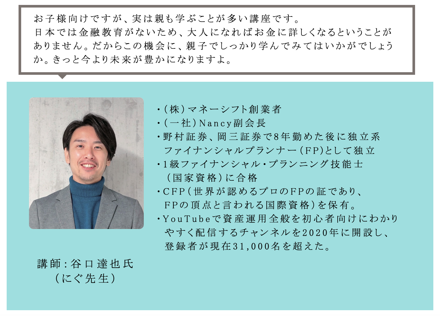小学校高学年から中学生の子どもを持つ親子を対象に、投資教育をメインとした金融教育を提供する本プログラム。1day入り口コース第1回は5月15日(日)10:15〜11:30より!