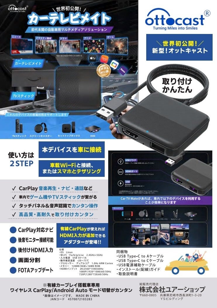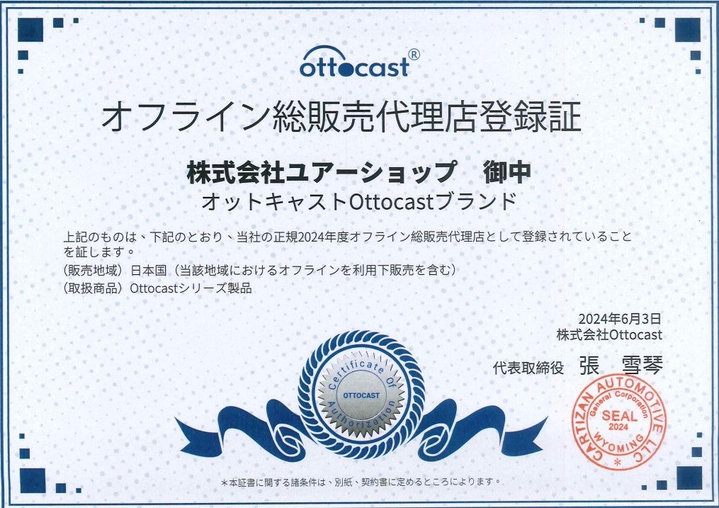 オリジナル商品の企画・輸入販売、および国内仕入卸売業・販売・製造を行う総合商社・株式会社ユアーショップ(兵庫県尼崎市西長洲町1-3-20 YSビルディング、代表取締役:西村直也)は、人気の車の電子製品のグローバルブランド⌈オットキャスト⌋の日本オフライン総販売代理の業務提携を2024年6月に締結したことをお知らせいたします。