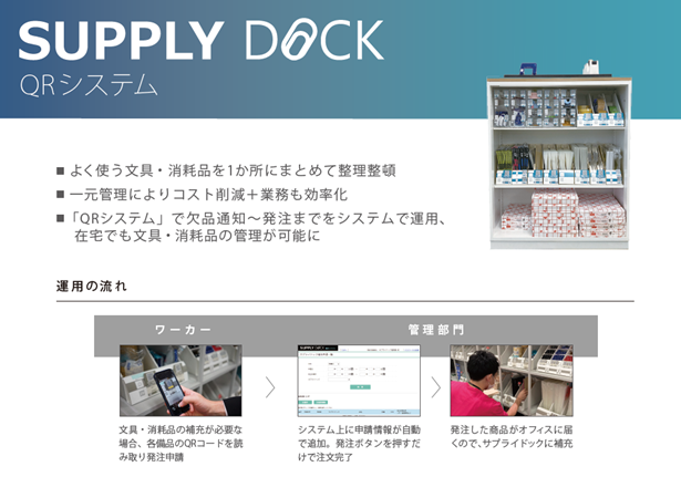 「SUPPLY DOCK」とは、オフィスで使う文具事務用品を1ヵ所で集中管理する新しい運用方法です。文具事務用品をまとめて設置することで、管理を一元化、発注業務を効率化し、スペースの有効活用や備品の共有化により無駄を省くことができます。大規模オフィスで普及しているフリーアドレスなどの新しい働き方にも対応しています。
