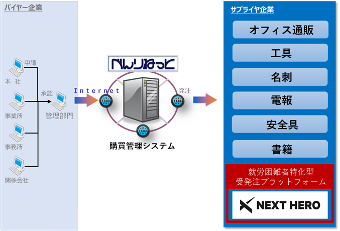 「べんりねっと」は、下記図のようにさまざまなサプライヤを接続することができる購買管理システムです。今回「NEXT HERO」と連携することで、見積依頼から発注までを「べんりねっと」で完結し、利用実績の全国一元管理を可能にします。