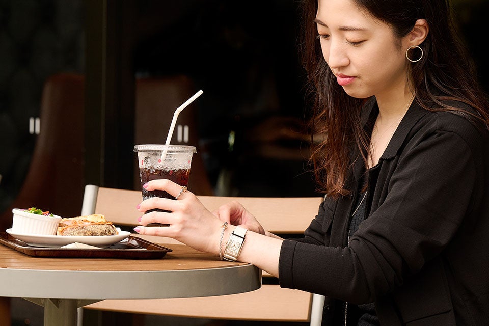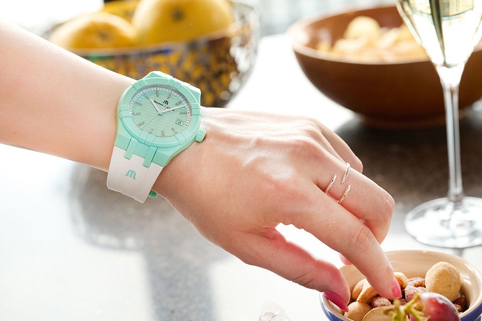 ラグジュアリースポーツウォッチの「アイコン」をベースに、ケース素材にオーシャンバウンド・プラスチックを使用。プラスティック素材の発色の良さを生かして、華やかなライトグリーン色に仕上げた。さらにストラップはホワイトのラバーなので、腕元がポップにまとまる。ケース径は女性にはやや大きな40mmだが、カジュアルなアクセサリーとして使うなら、むしろこのサイズ感がオシャレだ。クオーツ、再生プラスティックケース、ケース径40mm。111,100円(税込)