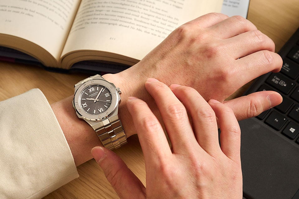 ショパールの共同社長を務めるカール-フリードリッヒ・ショイフレ氏が、1980年に考案したスポーツウォッチ「サンモリッツ」を、現代的にアップデートした "アルパイン イーグル"。アルプスに生息するワシの気品ある力強さにインスピレーションを受け、細部の仕上げもハイレベル。グレーダイヤルには、ワシの目の虹彩をイメージした美しい模様を取り入れた。自動巻き、ルーセントスティール™ケース、ケース径41mm。1,991,000円