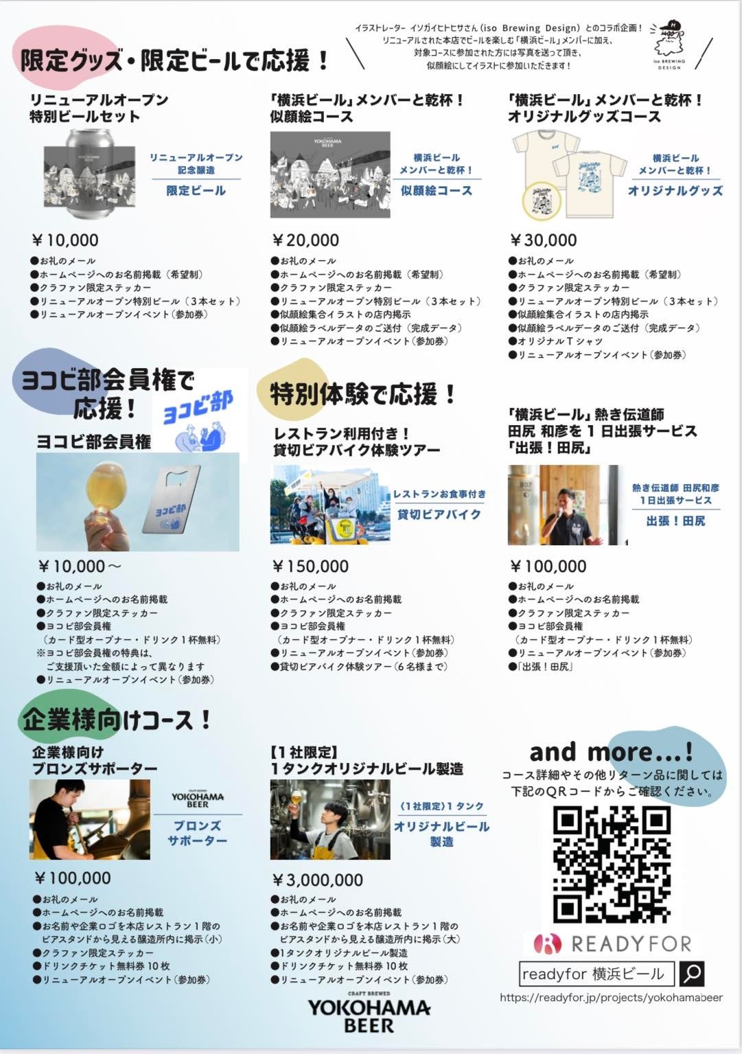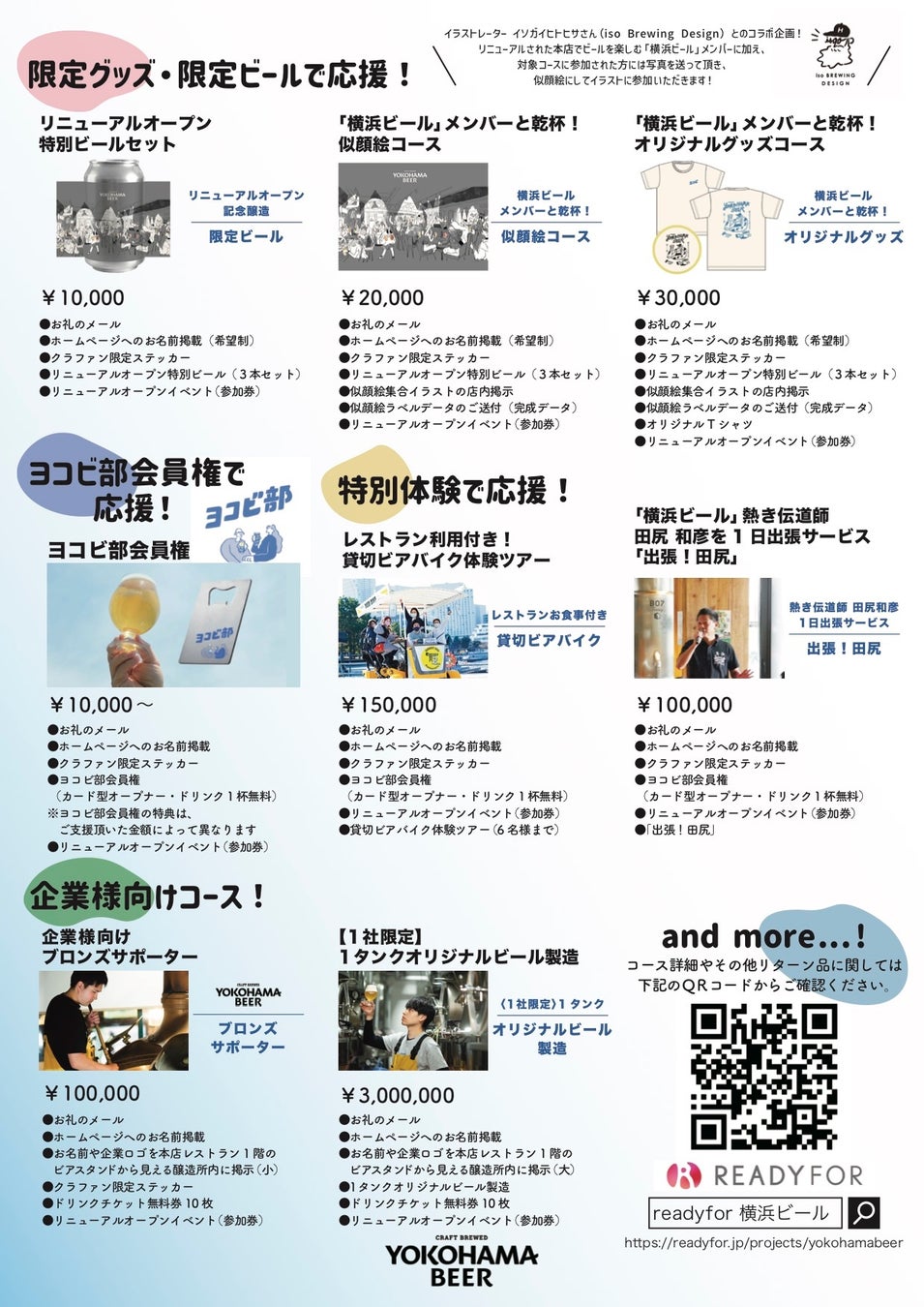 「リニューアルオープン記念醸造 限定ビール」「ヨコビ部会員権(カードオープナーつき)」「【1社限定】1タンクオリジナルビール製造」など
