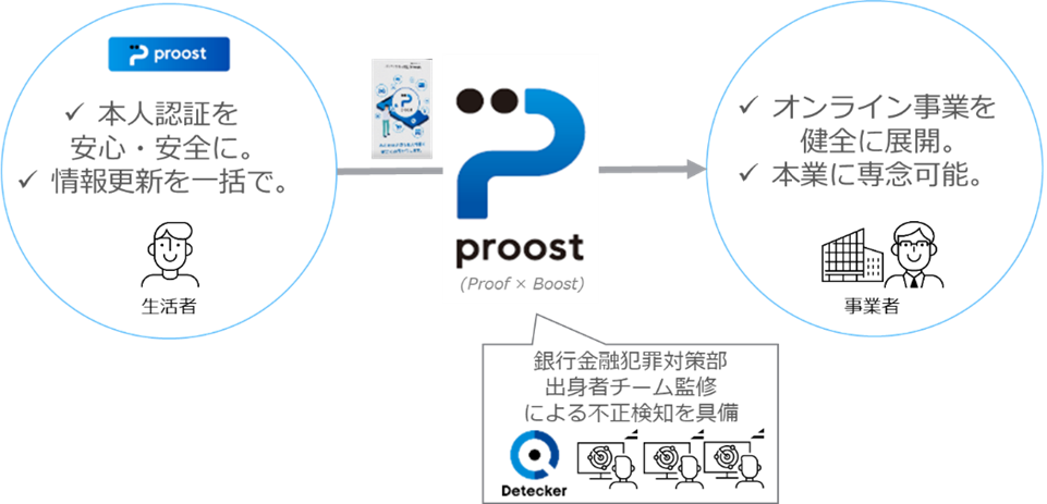 「proost(プルースト)」は、本人同意に基づき、登録された正しい本人確認情報(氏名、住所、免許証記載情報、本人撮影顔画像等)を保管し、認証の際は、本人の情報と登録された本人確認情報との照合を行います。また、本人が許可した企業を対象に、本人確認情報の連携を行います。不正検知機能の搭載により、なりすましなどの不正利用を防止するとともに、業務コストを低減し、安全性・効率性の高い本人確認を実現します。