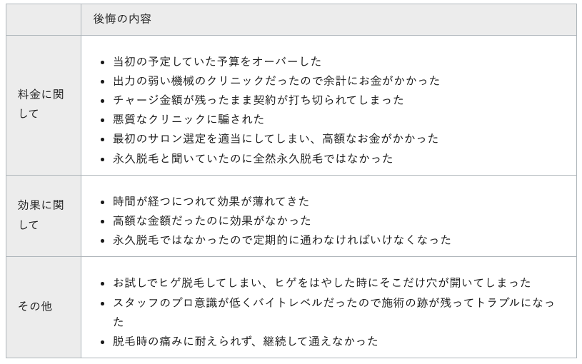 また、脱毛して毛を無くしてしまったこと自体に後悔している男性はごく少数という結果も得られました。可能性はゼロではありませんが、サロン・クリニック選びを慎重に行えば男性が脱毛後に後悔する可能性は低いと言えそうです。