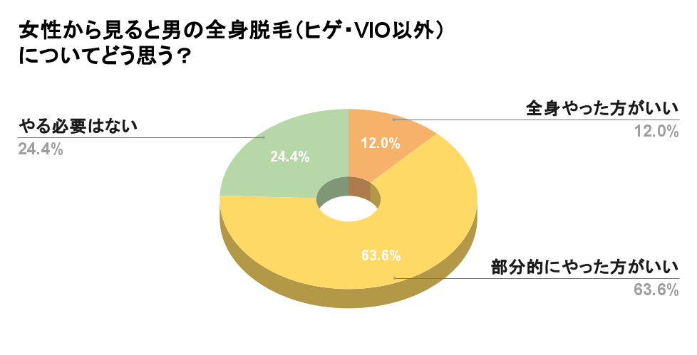 一方で、男性に対して、全身丸々の脱毛を求めている女性は12%と少ないです。そのため、脱毛を考えている男性は、女性が脱毛して欲しい部分TOP3(ヒゲ、胸、腹)から始めてみるのも良いかもしれません。