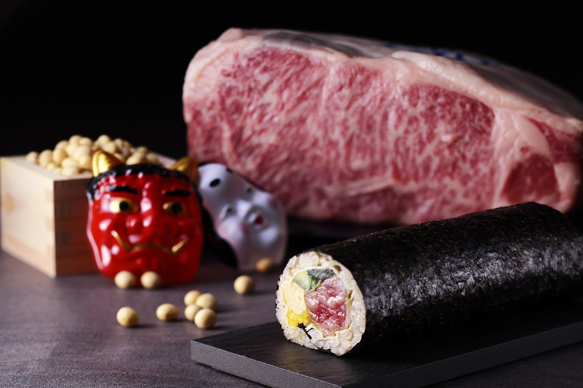 神戸ビーフのサーロインと黒トリュフを使い、卵焼き、三つ葉、大葉などと巻きました。一年に一度の節分を贅沢に演出いたします。20本の数量限定商品です。