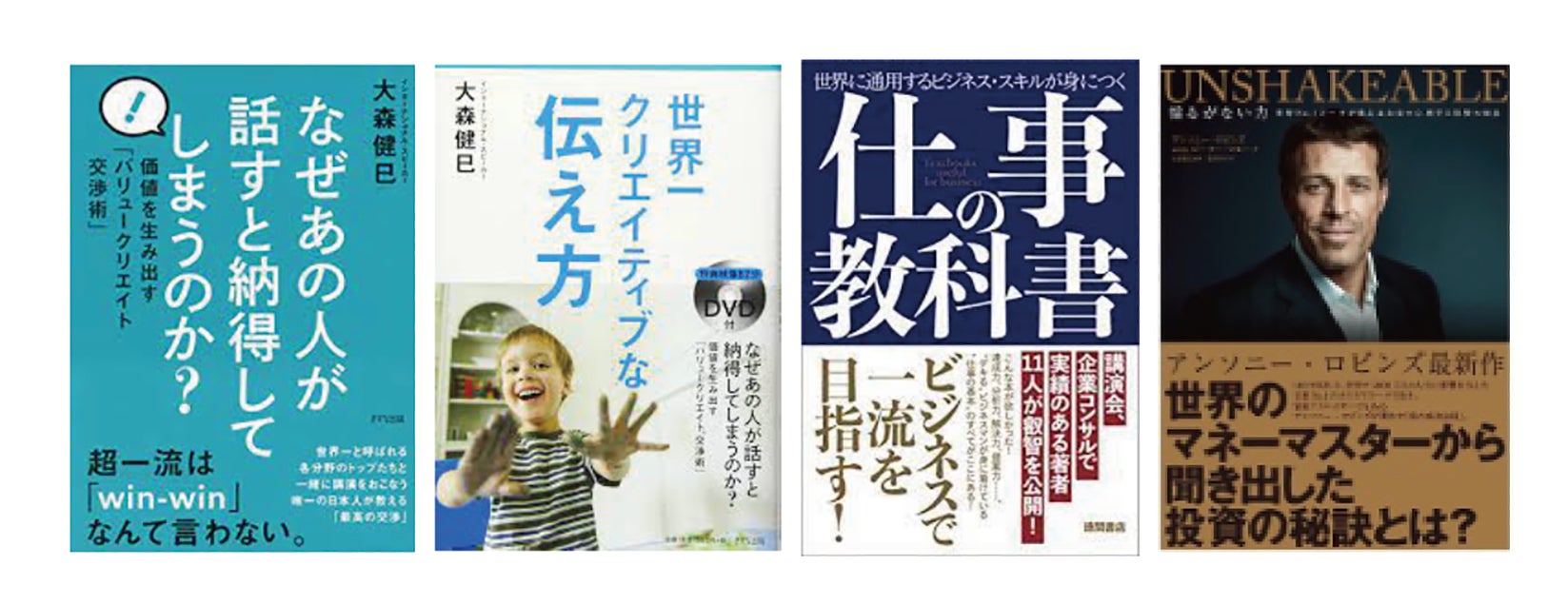 著書には『なぜあの人が話すと納得してしまうのか?」きずな出版、『仕事の教科書」徳間書店、監修『UNSHAKEABLE 揺るがない力 アンソニーロビンズ」ダイレクト出版 等。