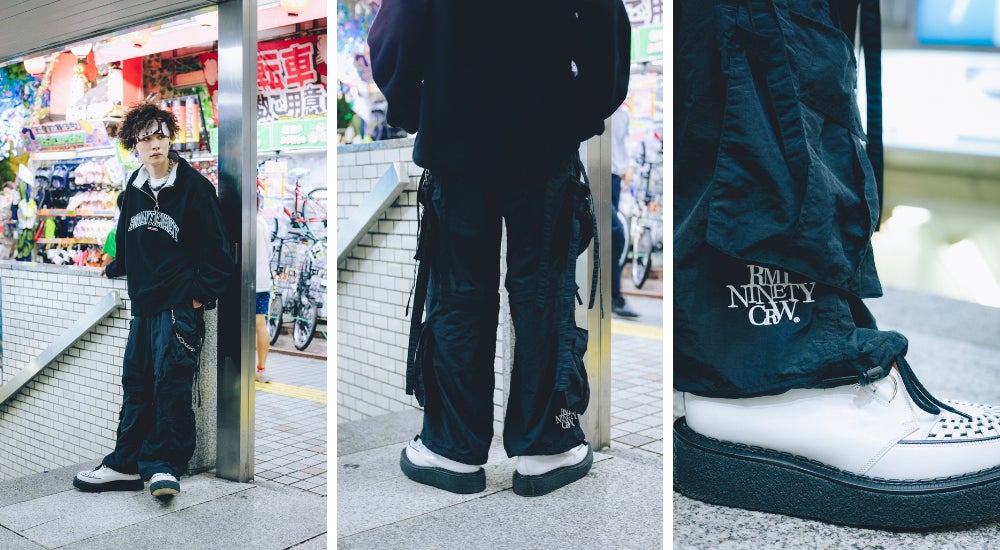 - 9090 TECHNO Cargo Pantsをベースに裾にコラボグラフィックを刺繍で表現。刺繍で施したバックの「NINETY」もポイント。