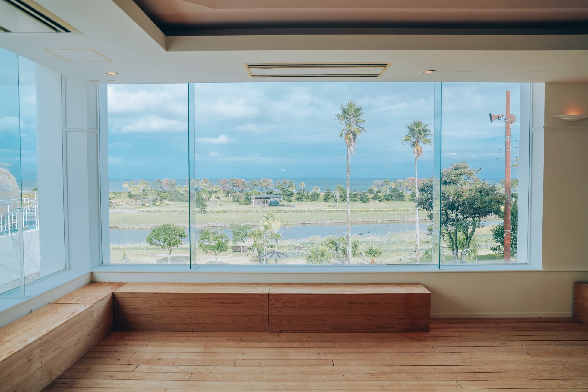 AOSHIMA PICNIC CLUB の CLUB HOUSE2階からは、青島の海はもちろん、園内を流れる川や、広大な自然などを眺められる特別な空間となっており、大自然に囲まれながらゆっくりとした時間を過ごすことができます。