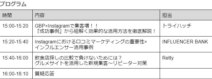 株式会社INFLUENCER BANK(本社:東京都港区、代表取締役:秋保 潤、以下INFLUENCER BANK)は、株式会社トライハッチ(本社:東京都新宿区、代表取締役:武藤 尭行)、Retty株式会社(本社:東京都港区、代表取締役:武田 和也)と共催で、飲食店向けWebセミナー「バズる集客術!今日からできる新規〜リピーター対策術(Google×SNS×グルメサイト)」を5月10日(水)15:00〜16:10で開催いたします。