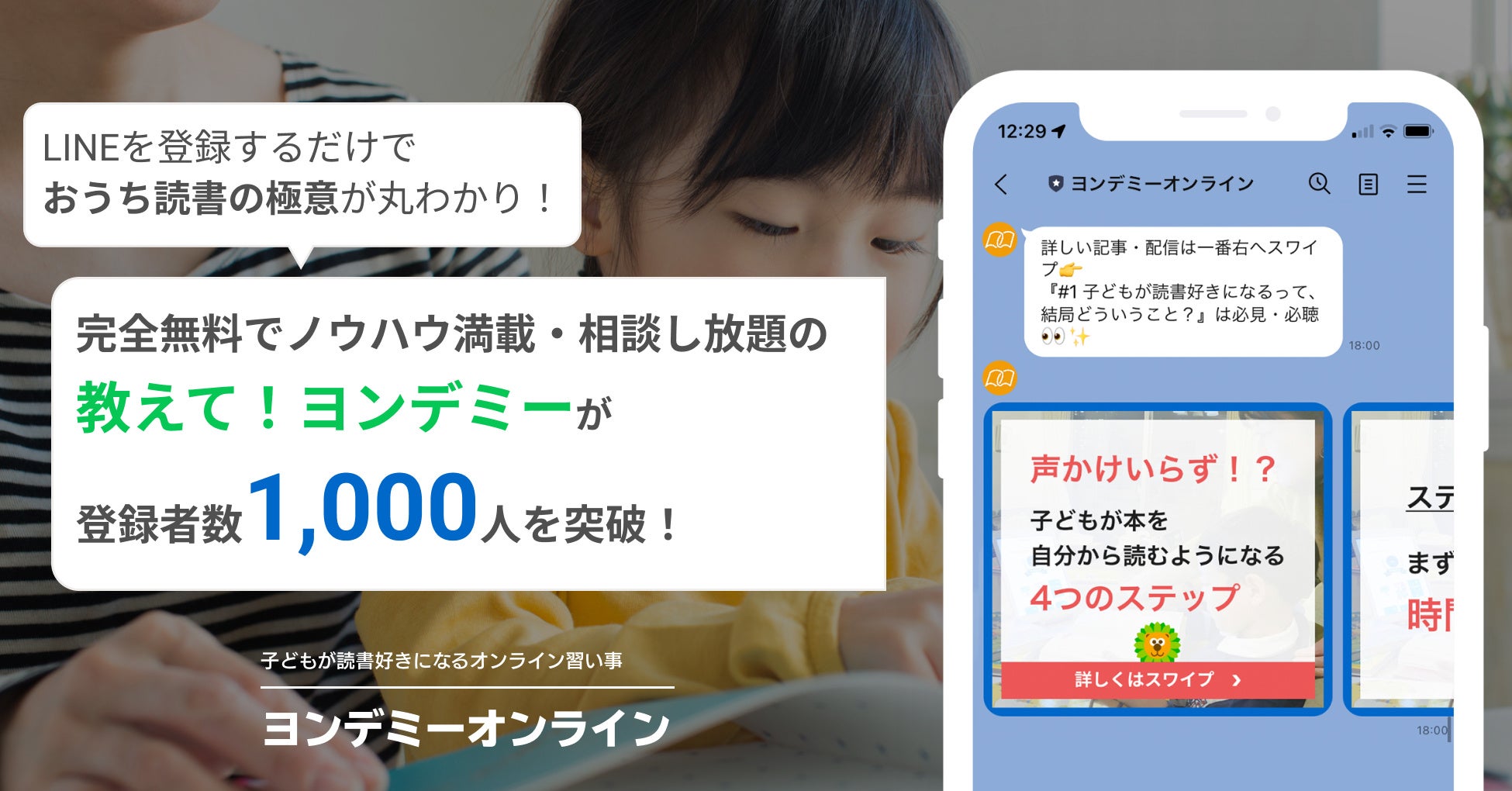 また、ヨンデミーオンライン公式LINEアカウント上にて提供しており、友だち追加後は相談受付に加え、家庭で気軽に実践できる読書教育のノウハウやコツを発信いたします。
