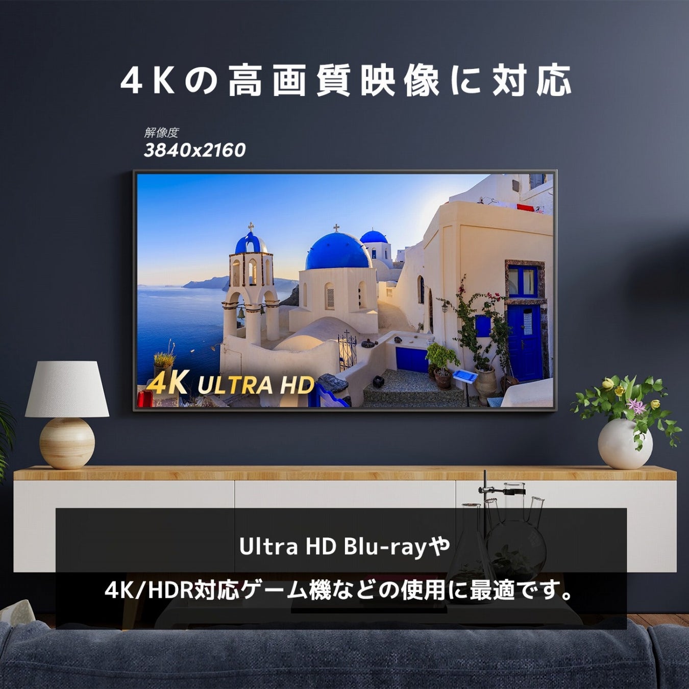 Full HD(1920x1080)の約4倍の解像度にあたる4Kに対応しています。また、伝送速度18Gbpsに対応していますので、Ultra HD Blu-rayや4K/HDR対応ゲーム機での使用にも最適なケーブルです。