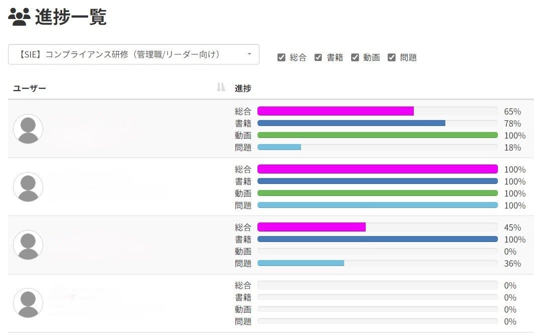 各研修毎に、書籍、動画、問題をそれぞれ誰がどこまで実施をしているか、一目で確認ができます。また、確認問題を設定している研修に関しては、正解率まで細かく確認ができる為、理解度レベルも把握できます。