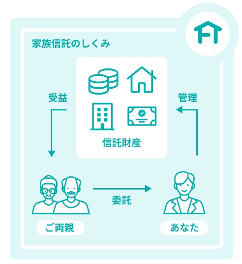 家族信託 とは、判断能力があるうちに大切な財産を信頼できるご家族に託すことにより、たとえ認知症などにより判断能力が低下した後でも、ご本人の希望やご家族のニーズに沿った、柔軟な財産の管理や運用を実現することを目的としたしくみです。