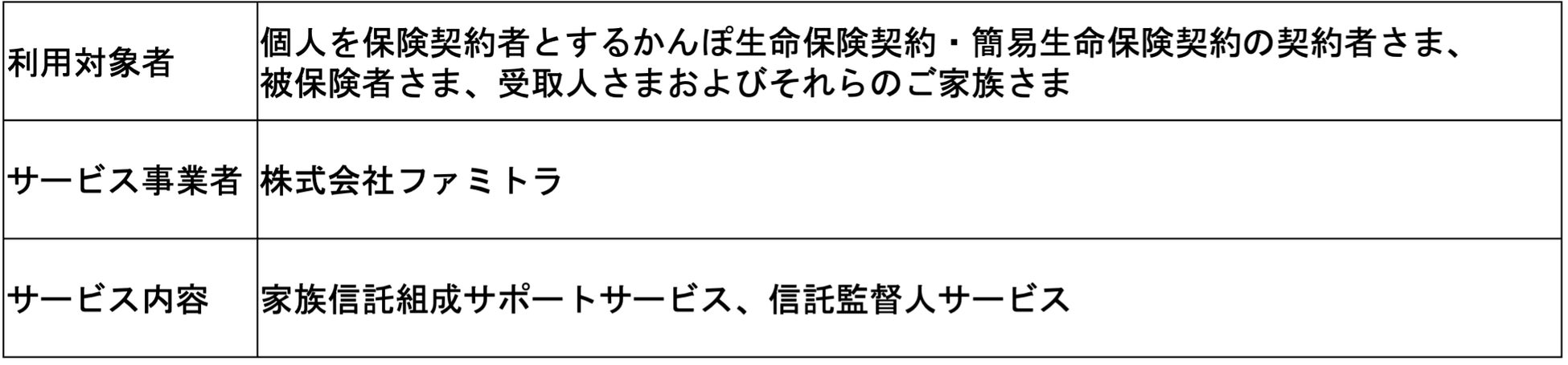 「家族信託」のサービスを提供する株式会社ファミトラ(東京都港区、代表取締役CEO:三橋 克仁、以下「ファミトラ」)は、株式会社かんぽ生命保険(東京都千代田区、取締役兼代表執行役社長:千田 哲也、以下「かんぽ生命」)と提携し、かんぽ生命のお客さまに対する家族信託サービスの提供を、2022年10月27日より開始いたします。