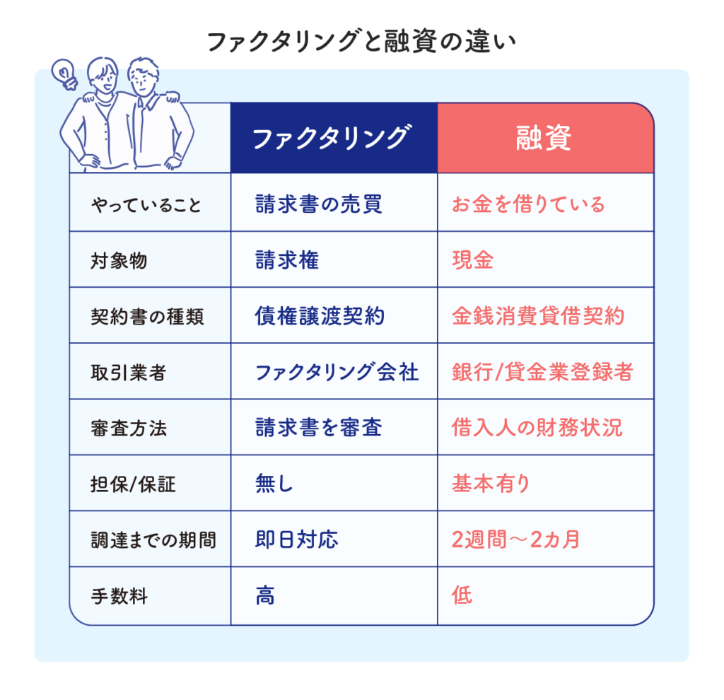 ファクタリングは「請求書(お金を受け取れる権利)を売却し、支払いを待たずに現金化する」という資金調達モデルなので、借金になりません。
