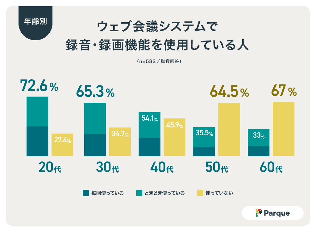 無料でずっと話せるミーティングアプリ「パルケミート」を開発・提供をする、株式会社パルケ(本社:東京都港区、代表取締役:鎌田大輔)は、「ウェブ会議の録音・録画に関する実態調査」について企業にお勤めの20~60代の男女583人を対象に調査を実施しました。今回の結果から、ウェブ会議の録音・録画機能は若年層の利用率が高く、その利用目的は「議事録代わり」が大半を占めているということがわかりました。