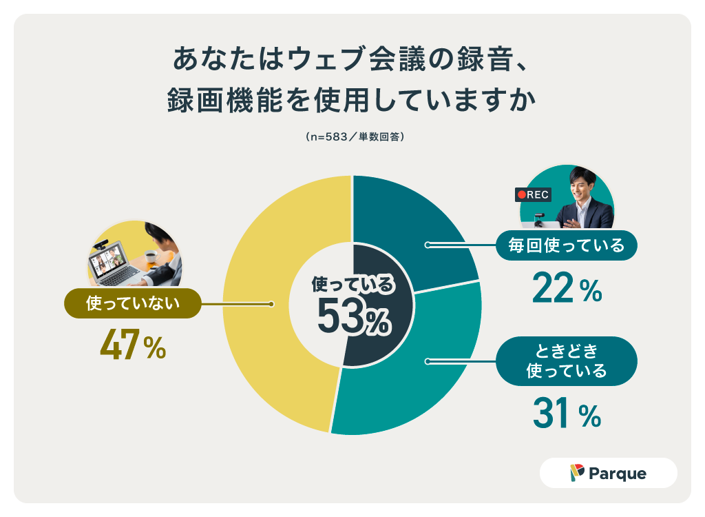 職場でウェブ会議システムを使用している20~60代の男女583人に、ウェブ会議システムの「録音・録画機能」を使用していますか、とたずねたところ、「使っていない」と回答した人が47%となりました。