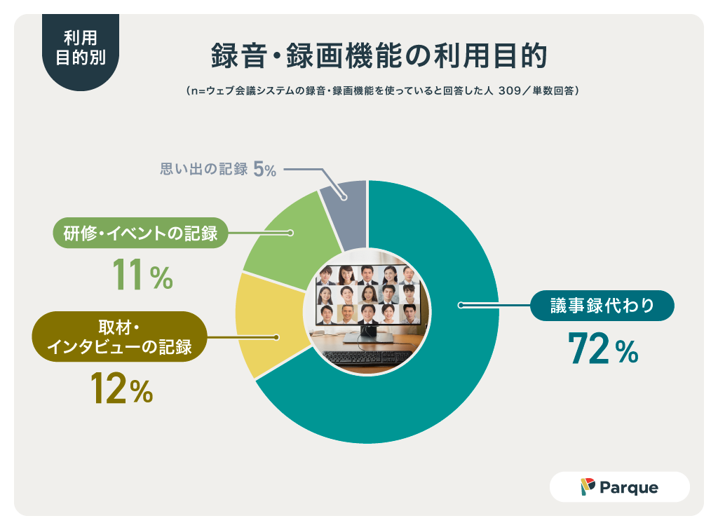 ウェブ会議システムの録音・録画機能を使っていると回答した人に、利用目的をたずねたところ、「取材・インタビューの記録(12%)」、「研修・イベントの記録(11%)」、「思い出の記録(5%)」に対し、「議事録代わり」と回答した人が72%と圧倒的に多い結果となりました。