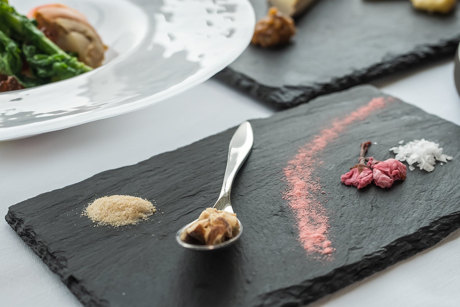 塩や砂糖・ナッツ等を味わい、五感を考える一品からスタート